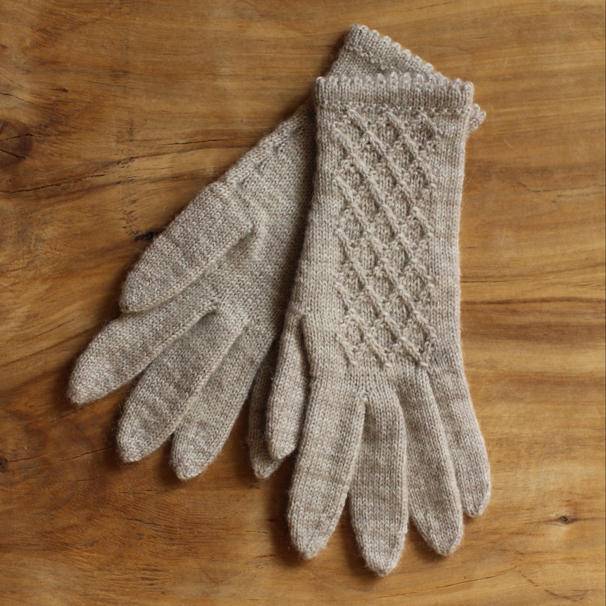 Rokām adīti smilškrāsas pirkstaiņi ar lielāku rombiņu rakstu plaukstas virspusē (INVA 46)