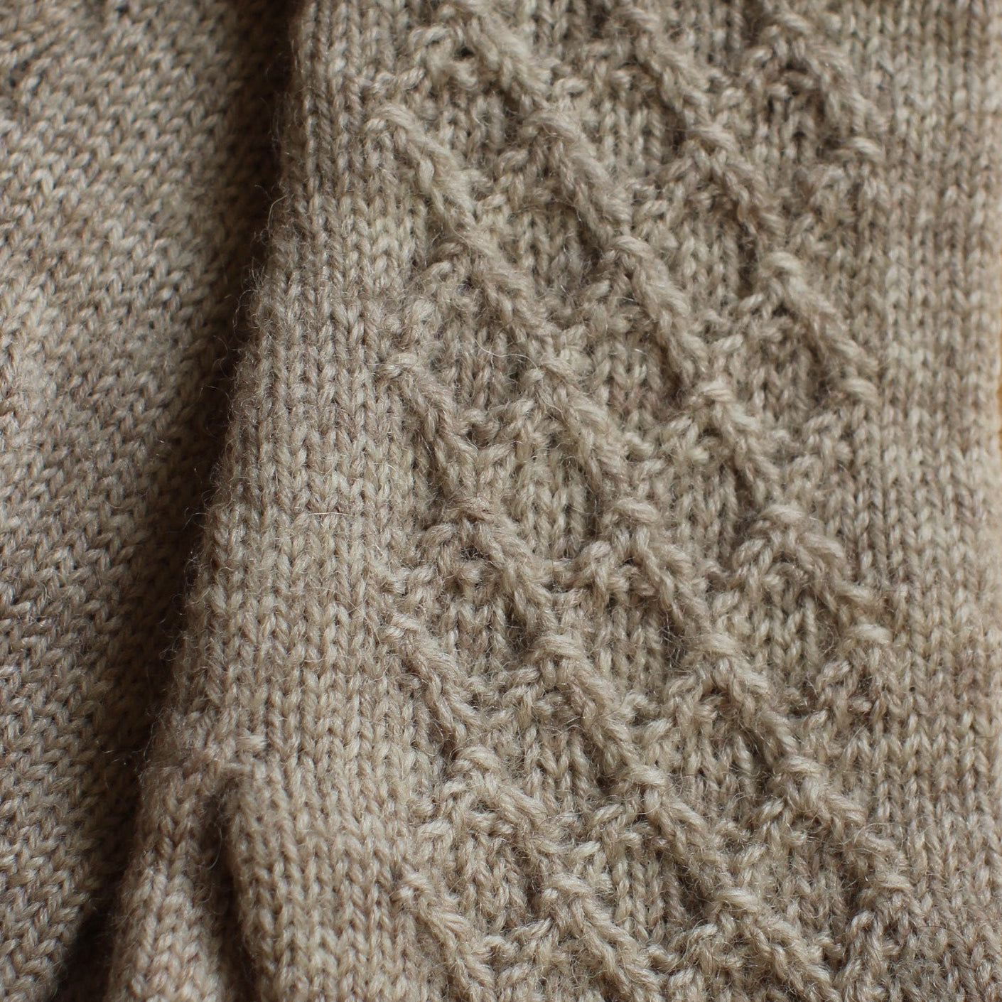 Rokām adīti smilškrāsas pirkstaiņi no vilnas dzijas (superwash comfort 75% SW vilna, 25% poliamīds) ar dekoratīvu lielāku rombiņu raksta adījumu plaukstas virspusē 23 x 8 cm (garums x platums).
