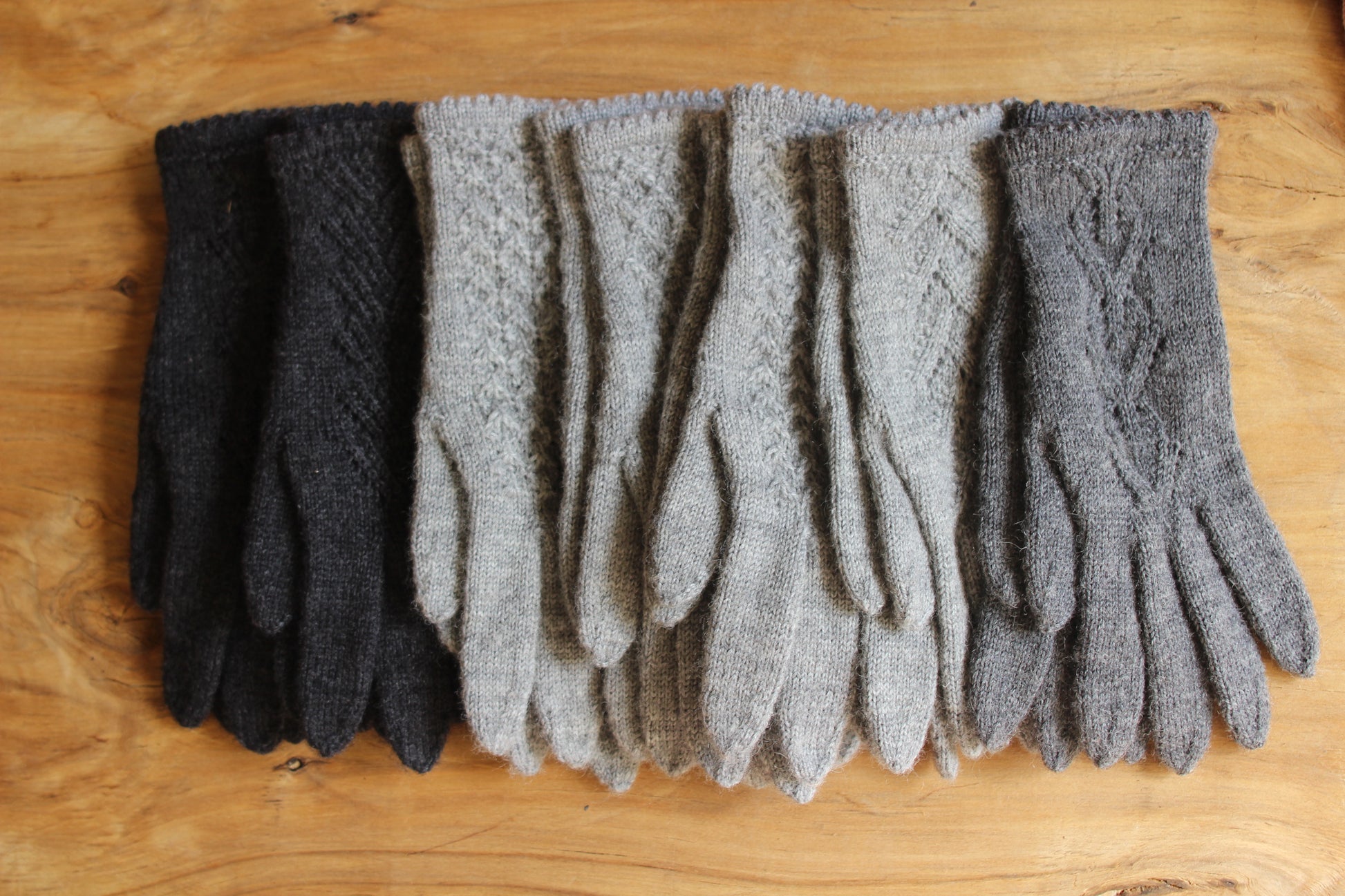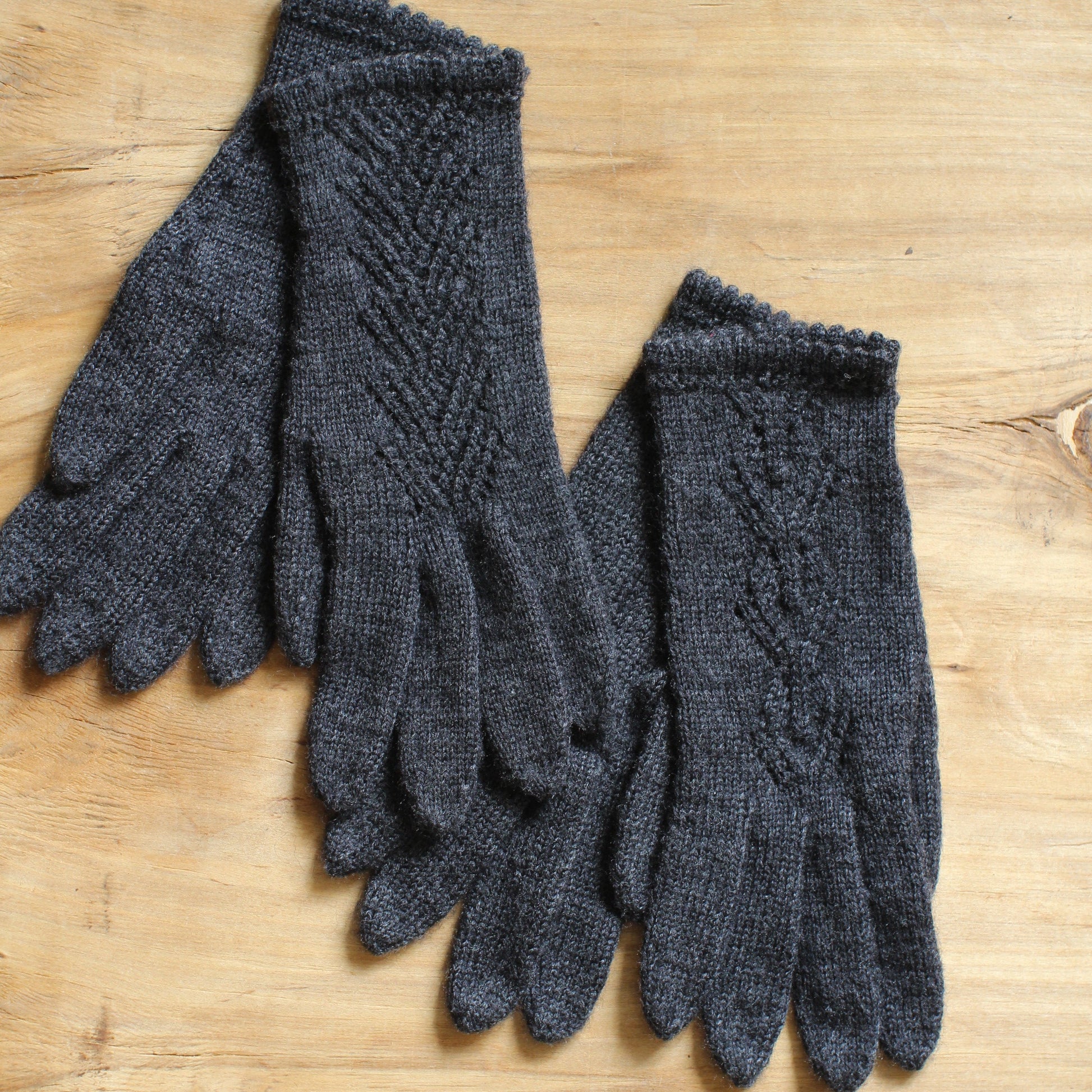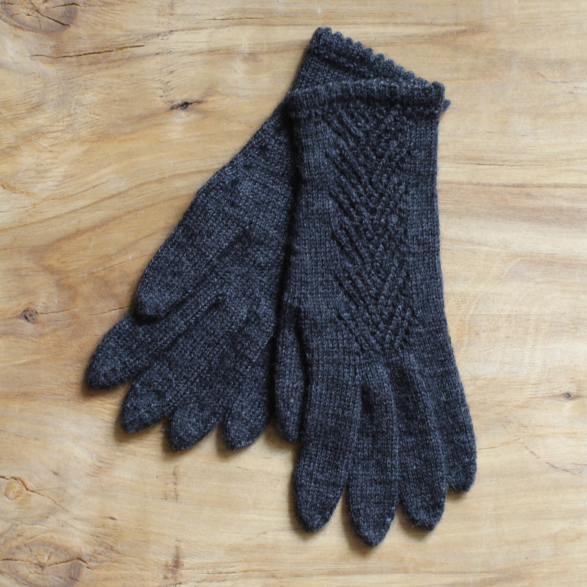Rokām adīti tumši pelēki pirkstaiņi ar mežģīņu skujiņas rakstu plaukstas virspusē (INVA 36)