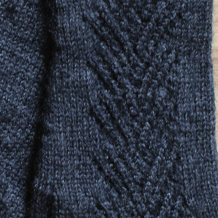 Rokām adīti tumši pelēki pirkstaiņi no vilnas dzijas (superwash comfort 75% SW vilna, 25% poliamīds) ar dekoratīvu skujiņas raksta adījumu plaukstas virspusē 23 x 8 cm (garums x platums).