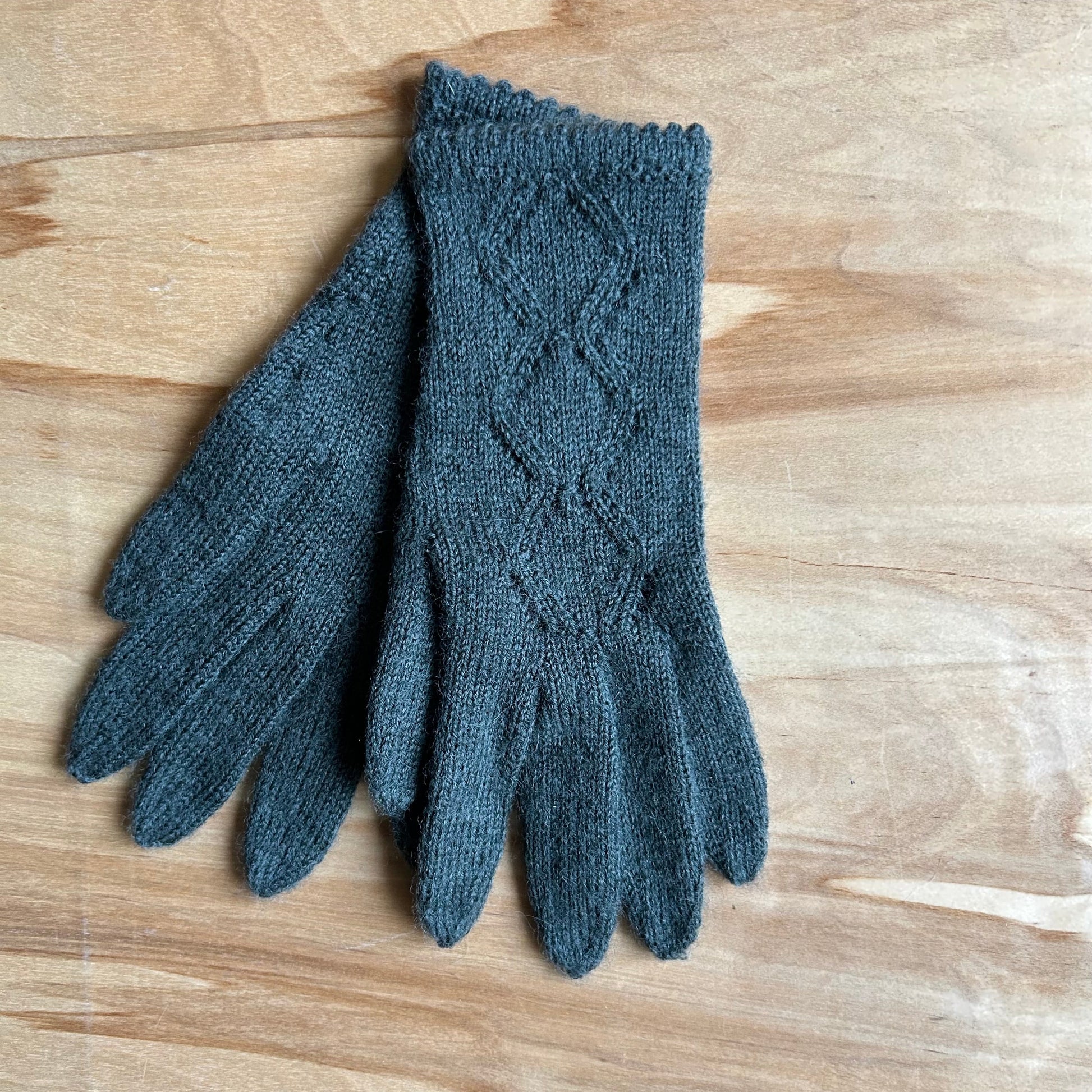 Rokām adīti tumši pelēkzaļi pirkstaiņi no vilnas dzijas (superwash comfort 75% SW vilna, 25% poliamīds) ar dekoratīvu rombu raksta adījumu plaukstas virspusē 23 x 8 cm (garums x platums).