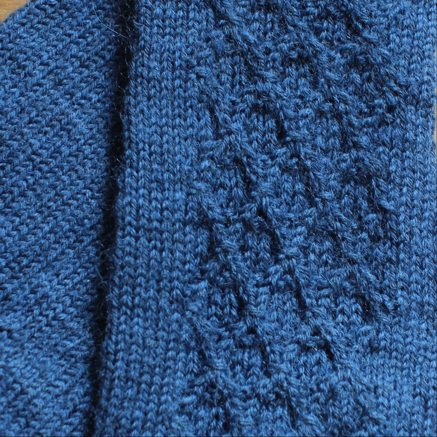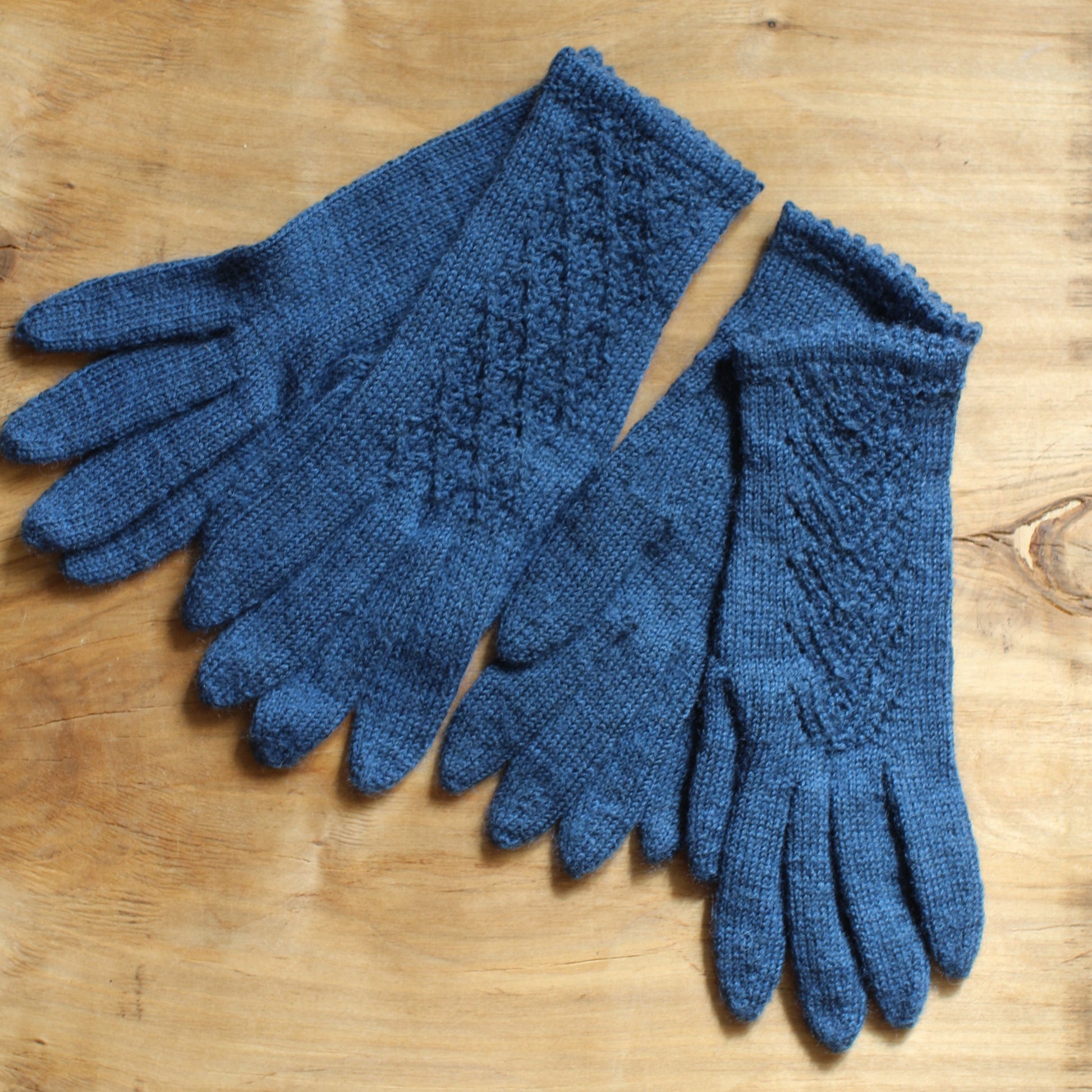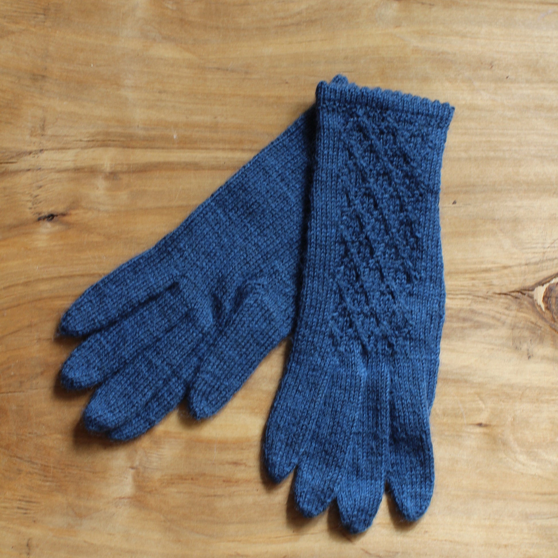 Rokām adīti zili pirkstaiņi no vilnas dzijas (superwash comfort 75% SW vilna, 25% poliamīds) ar dekoratīvu mežģīņu rombiņu raksta adījumu plaukstas virspusē 23 x 8 cm (garums x platums).