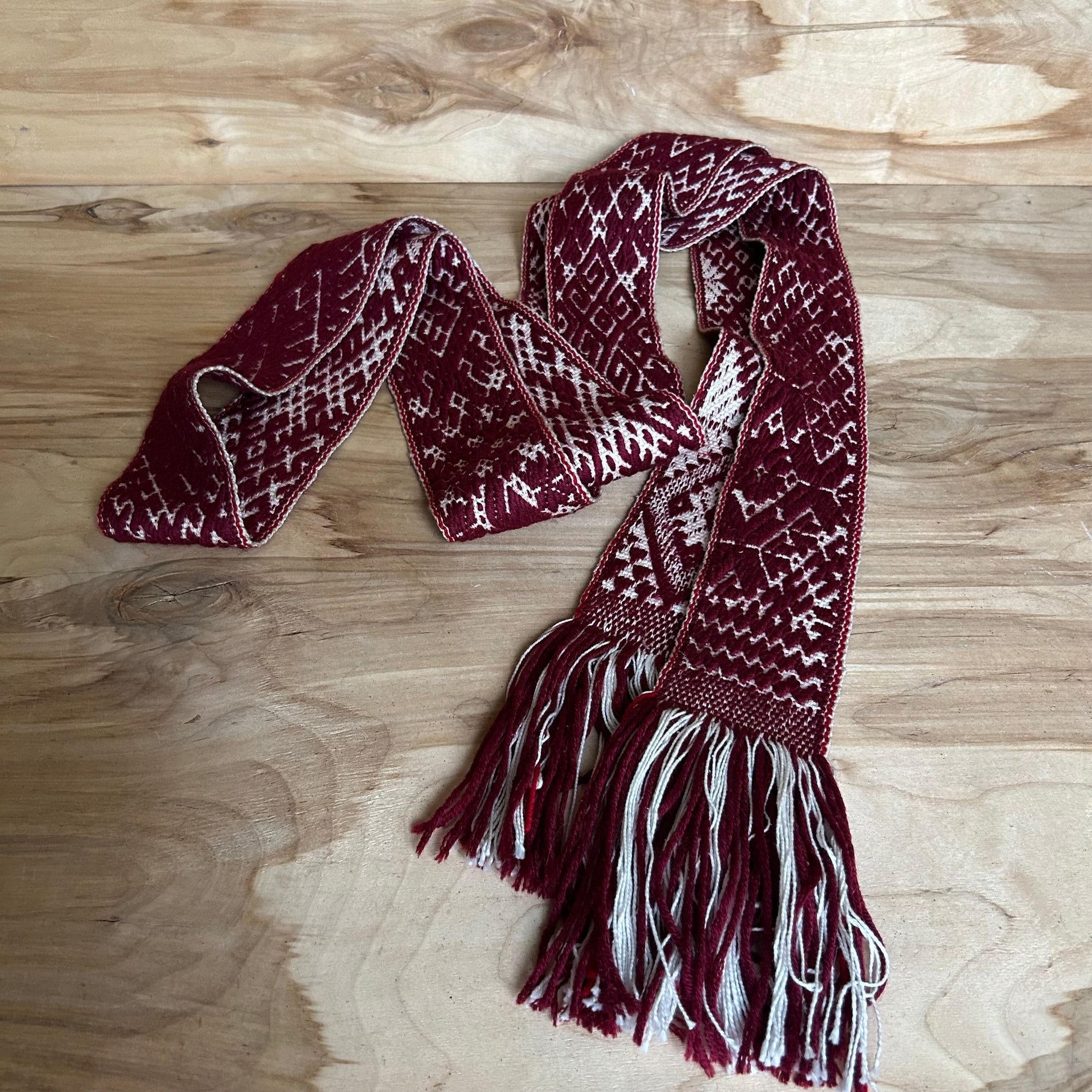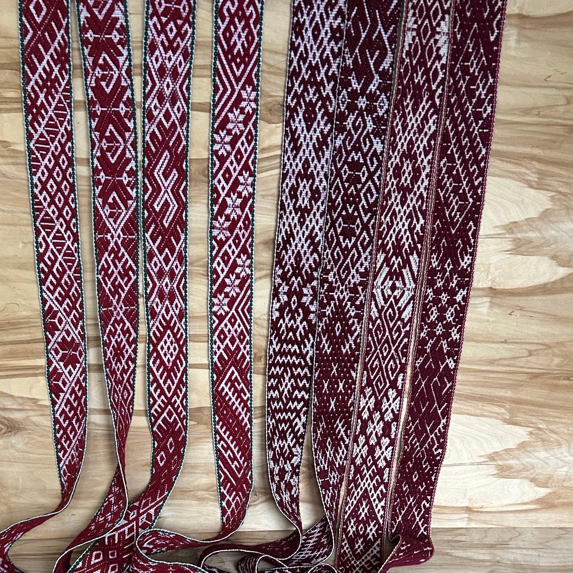 Ar rokām austa tautiskā josta sarkanos un pienbaltos toņos. Jostas garums (bez bārkstīm) 340 x 8,5 cm.