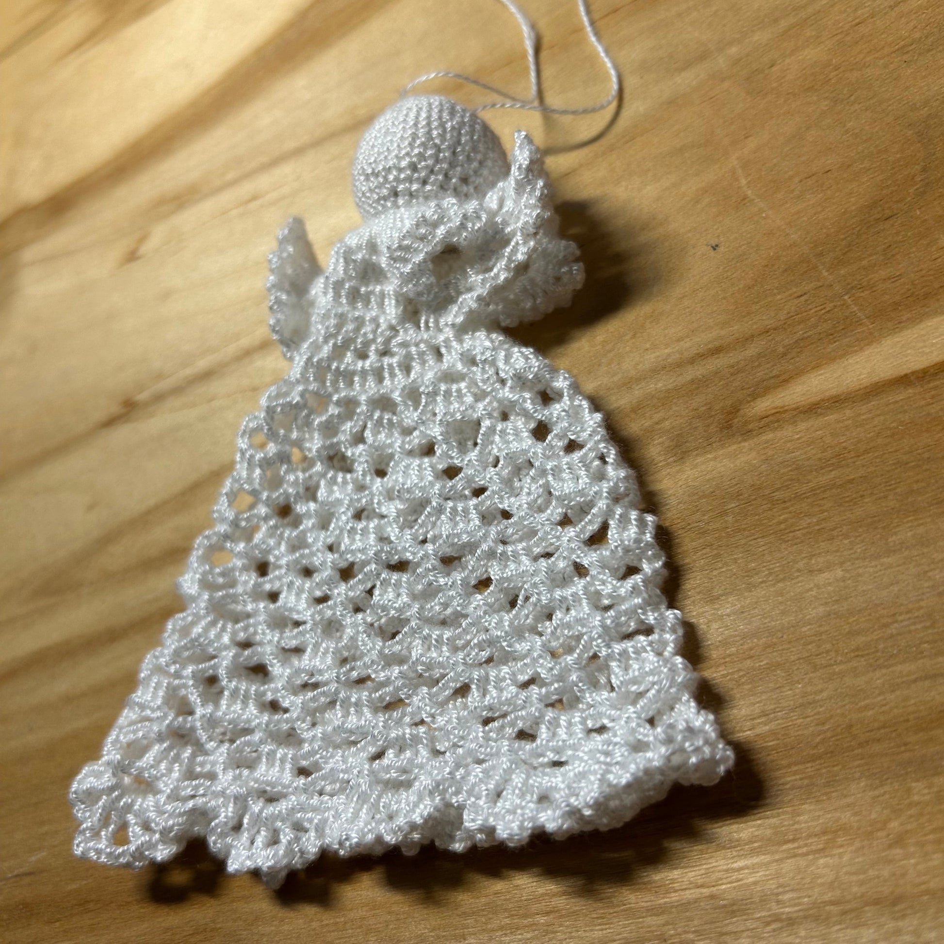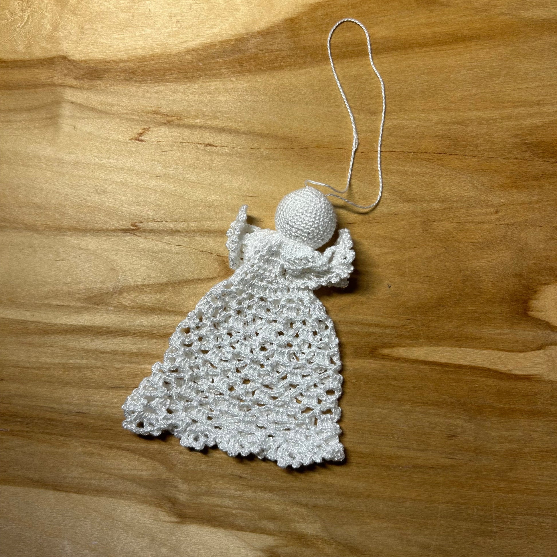 Rokām tamborēts mežģīņu eņģelītis 10,5 cm augsts, 8 cm plats. Pie galvas tamborēta cilpiņa.