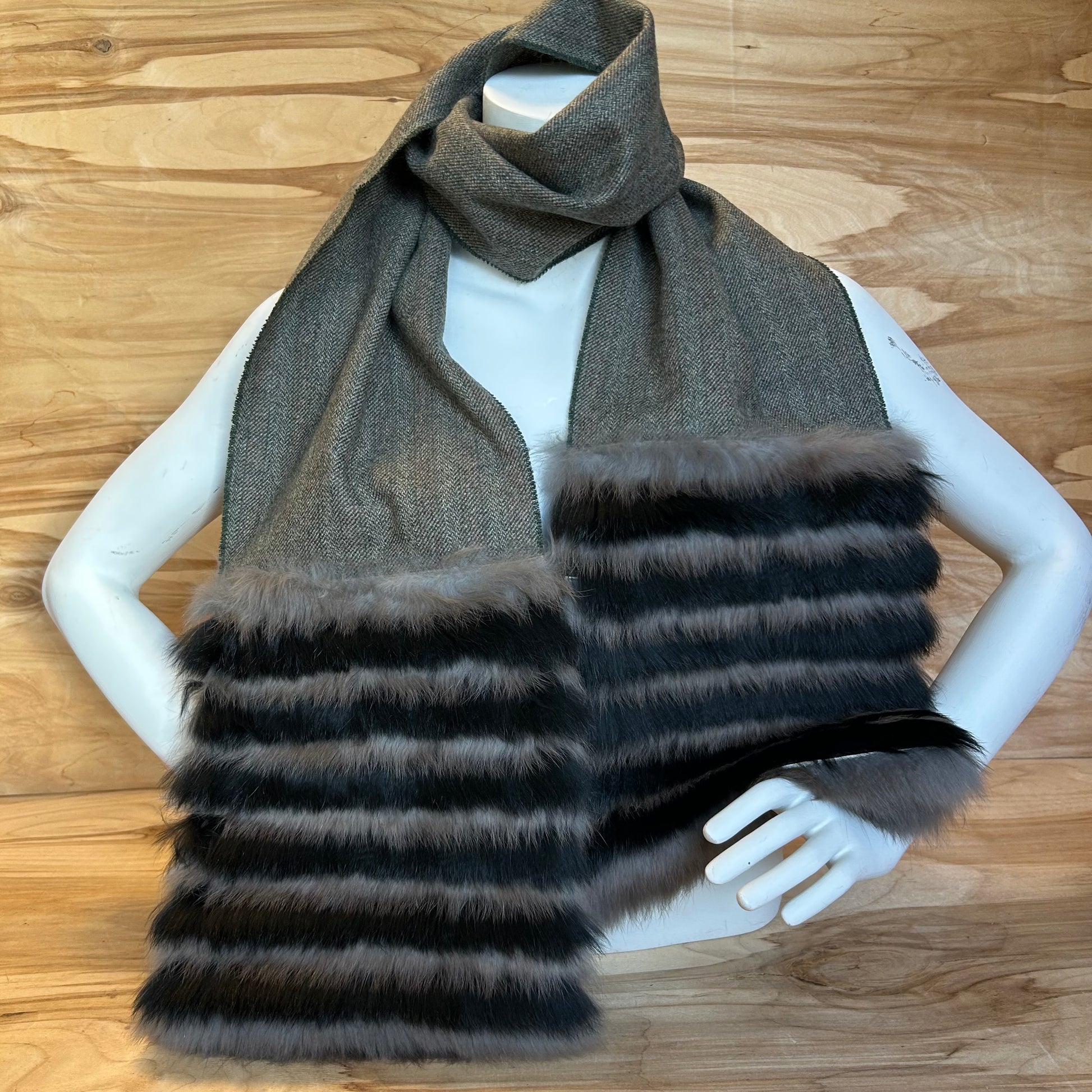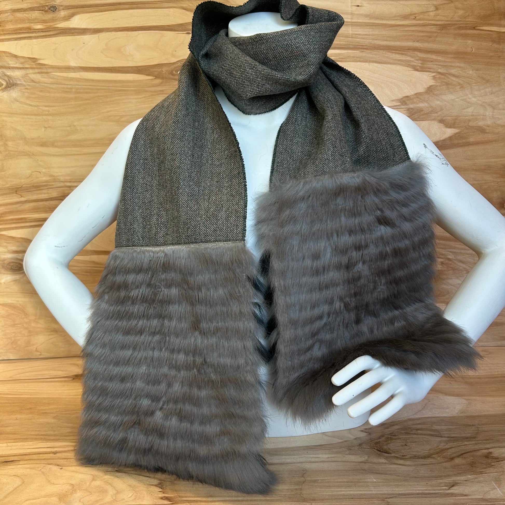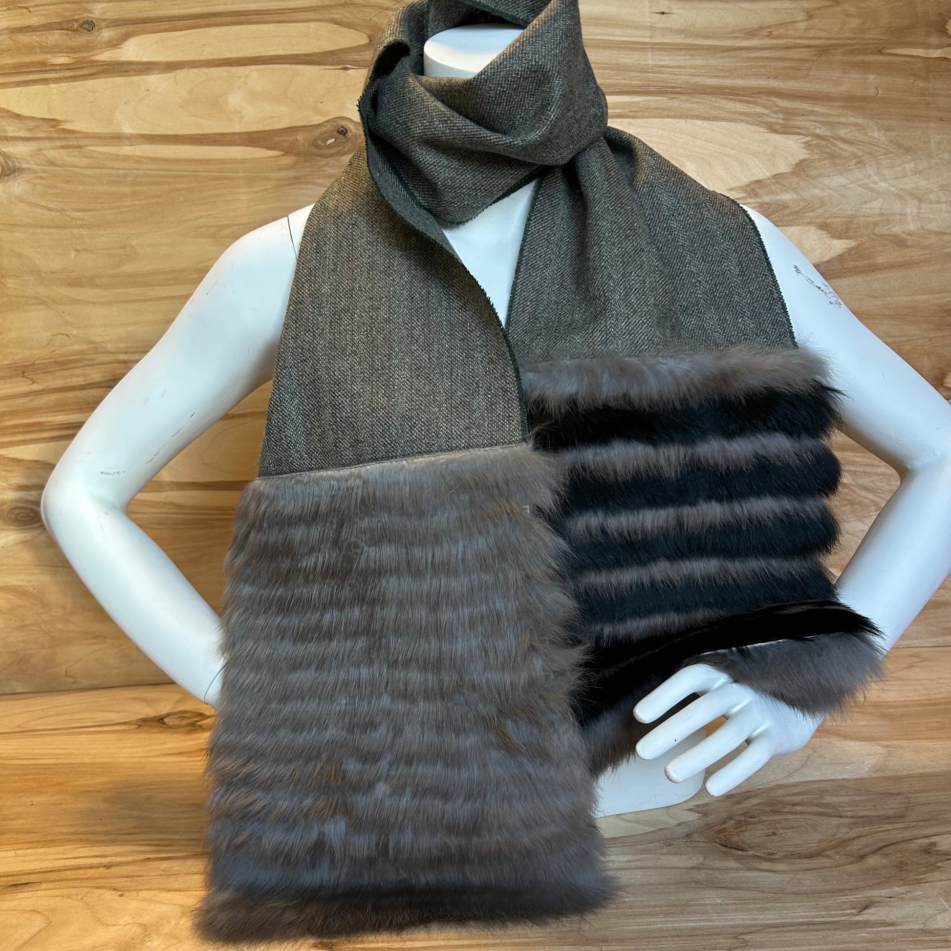 Pelēkbrūna vilnas auduma šalle ar abpusēji dekoratīvām gaiši brūnām un raibām truša vilnas malām. Katrā šalles pusē atšķirīgs pūkas tonis.