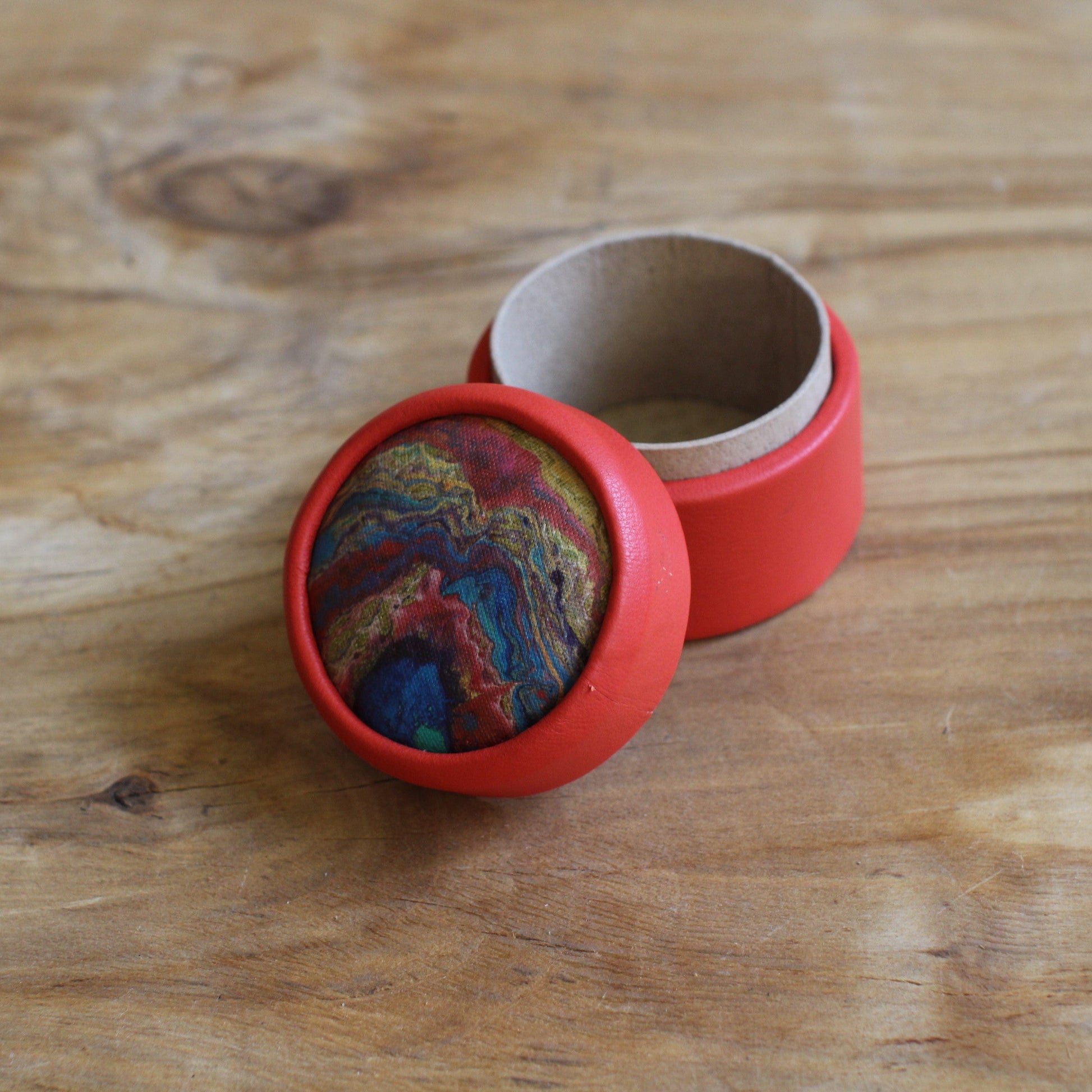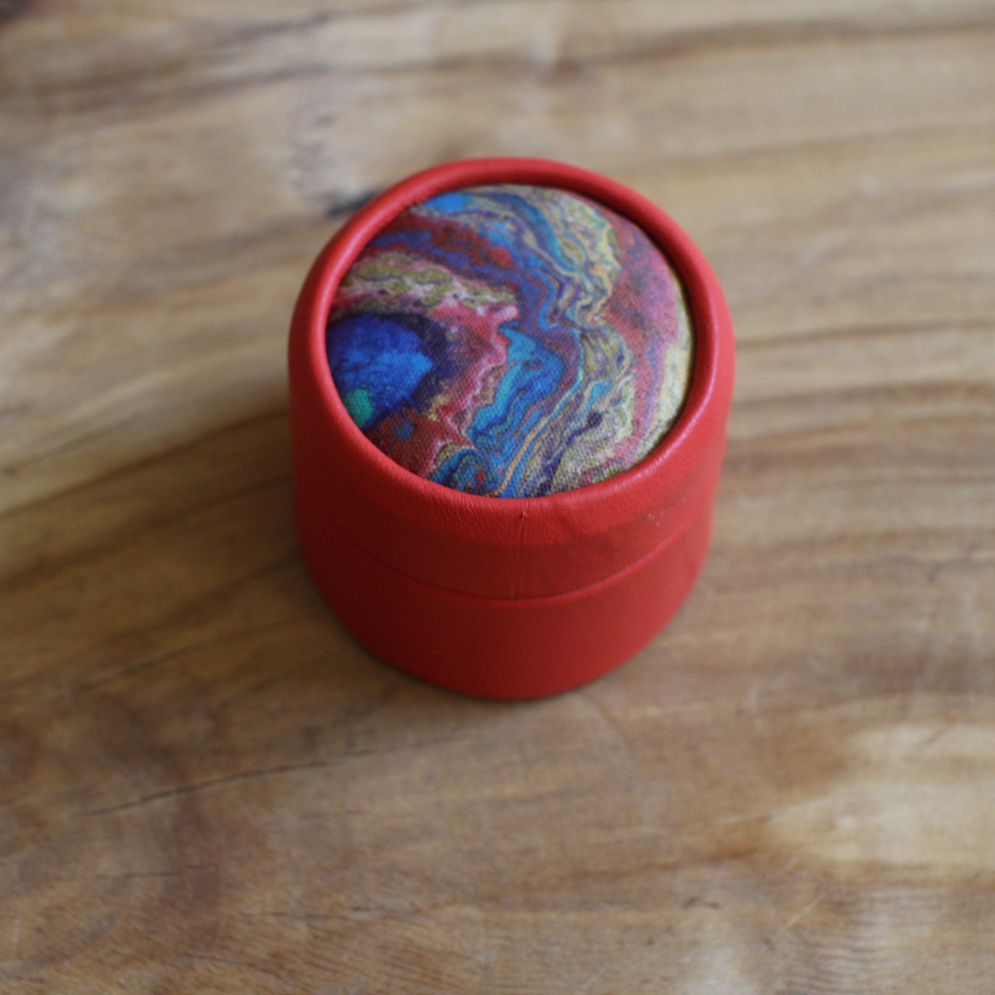 Sarkana, apaļa dekoratīva ādas kārbiņa (S) ar zilgani marmorētu vāku (RARA 252)