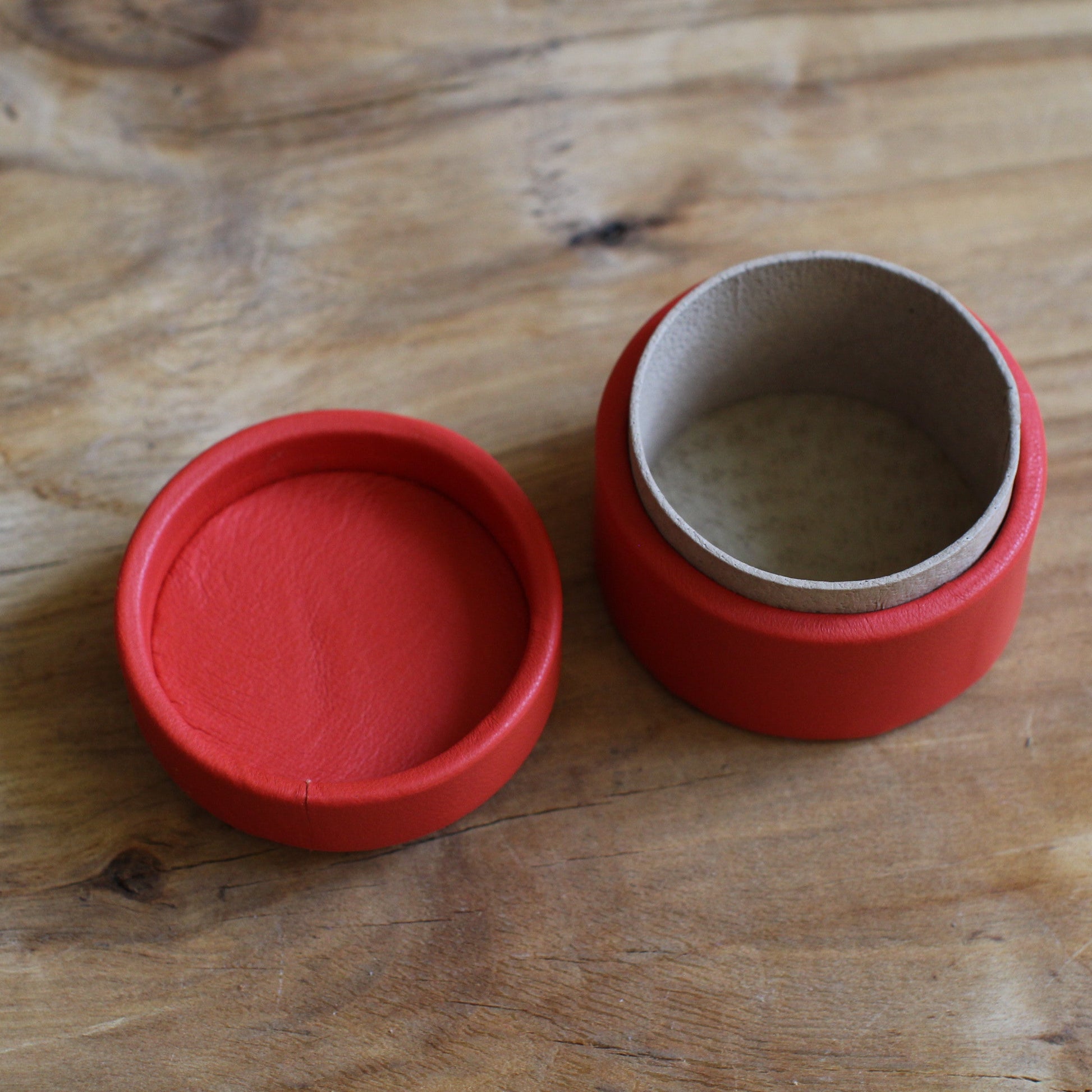 Sarkana ar dabīgo ādu apvilkta apaļas formas S izmēra (pamats ~7 cm diametrā / augstums ~6 cm) dekoratīva kārbiņa ar gaiši pelēkbrūnas ādas oderējumu un zilganu toņu marmorētu ādas vāciņa virspusi.