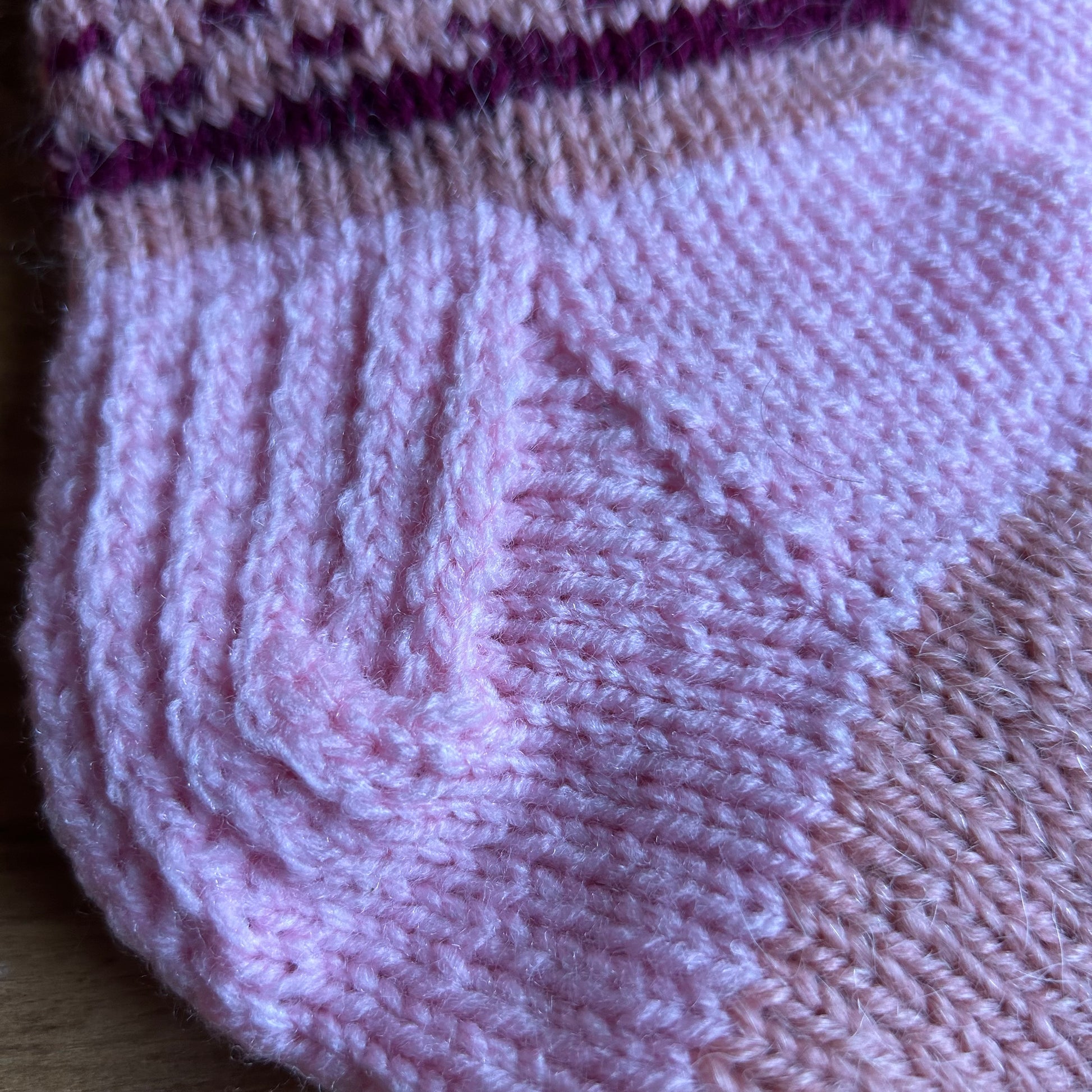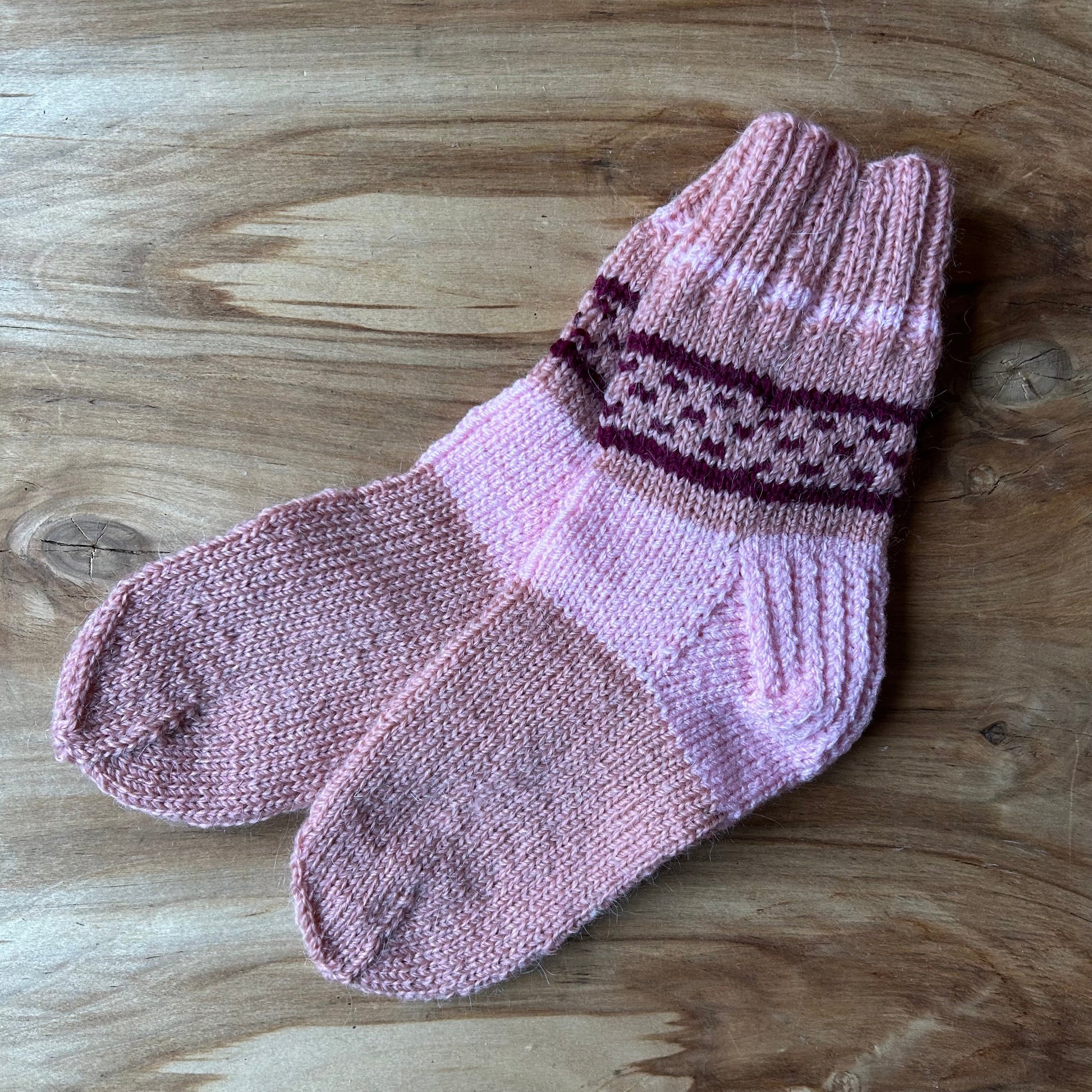 Rokām adītas siltās zeķes 34.-36.izm. Rozā un vecrozā krāsā. ar tumšāku ornamentu uz stulma