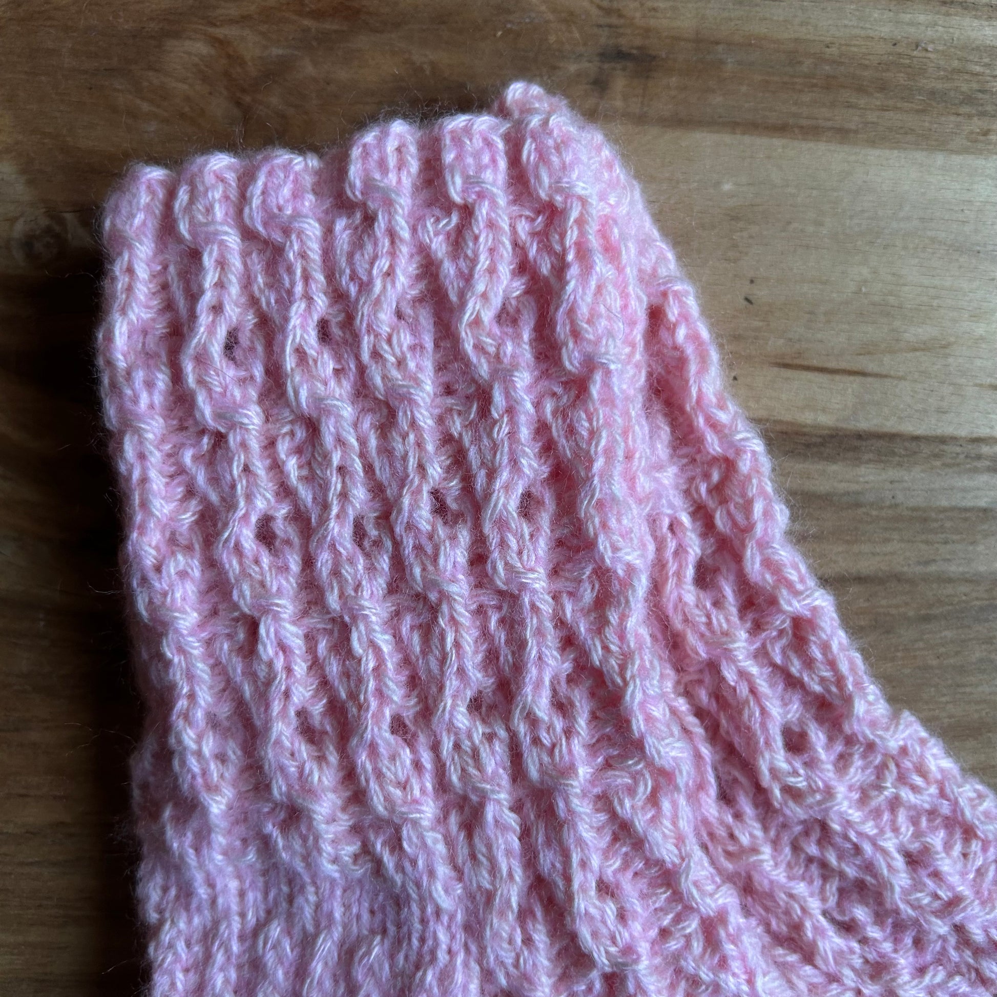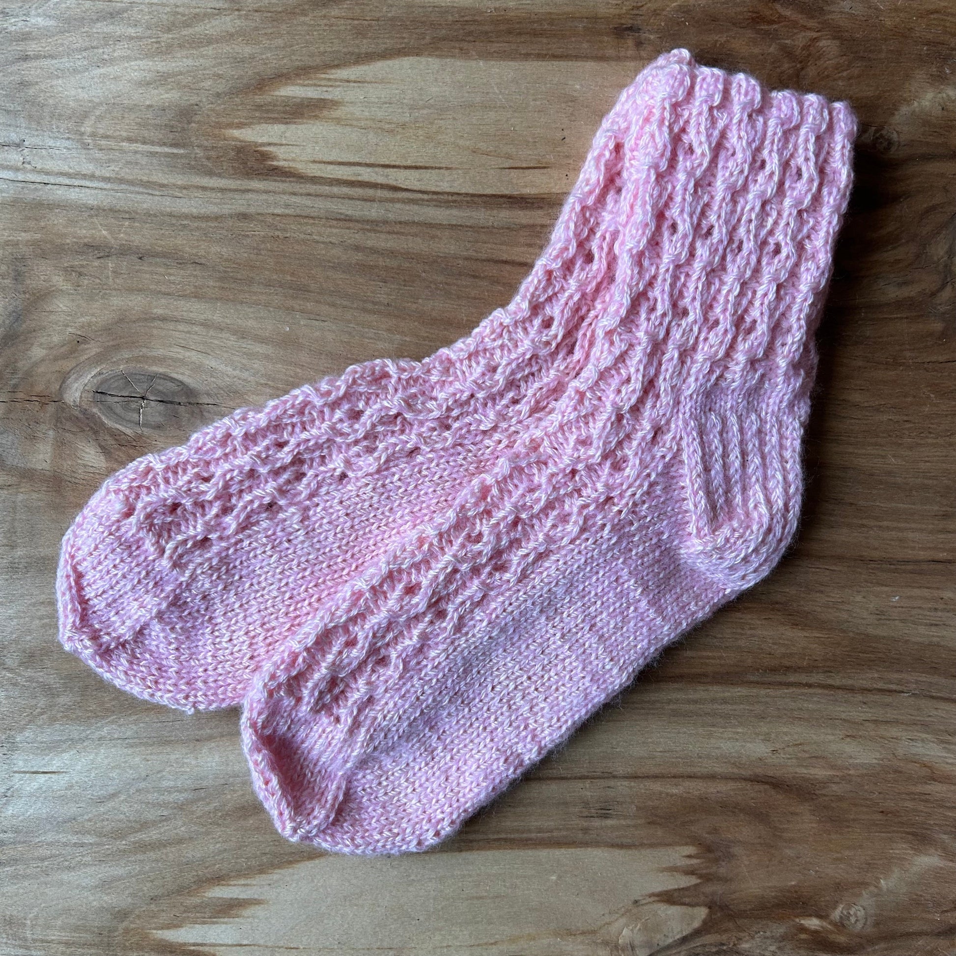 Rokām adītas siltās zeķes 31.-33.izm. rozā krāsā mežģīņraksta adījumā.