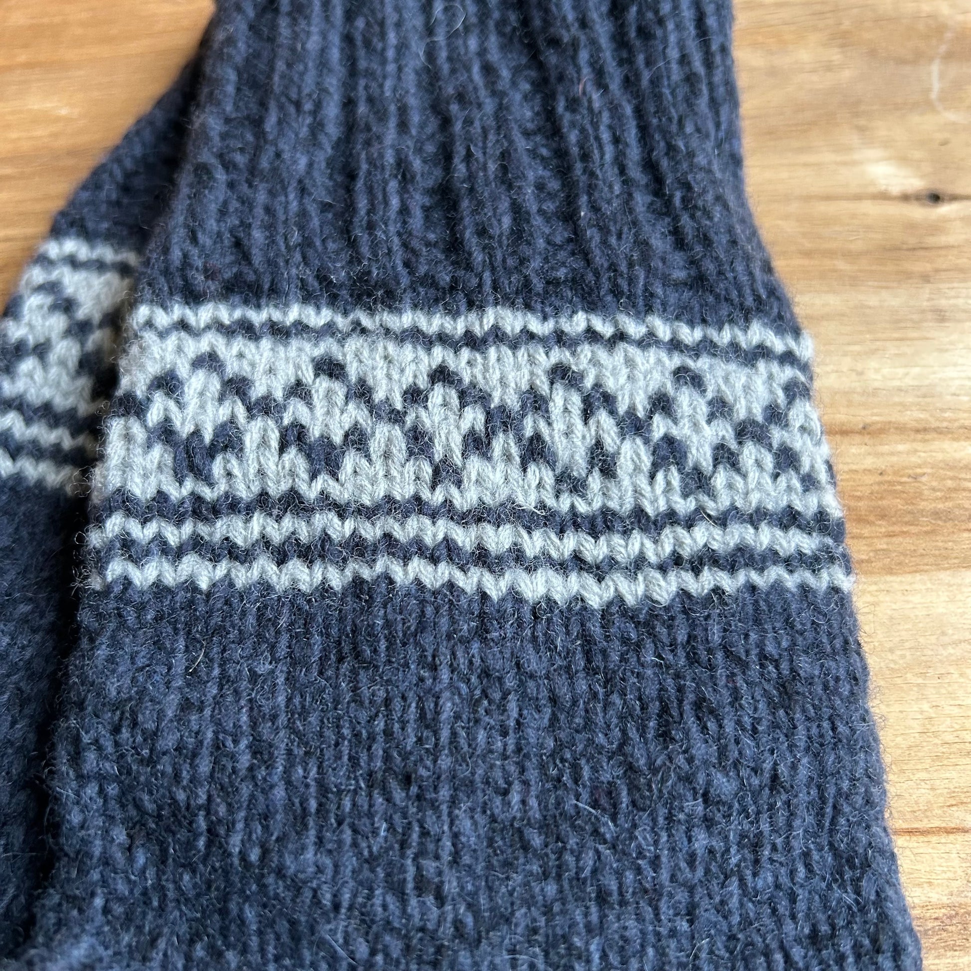 Rokām adītas vilnas zeķes gludā adījumā 39.-41.izm. zilā krāsā ar pelēkiem ornamentiem. Adītās pēdas garums neiestiepjot 25 cm. Stulma augstums 20 cm.