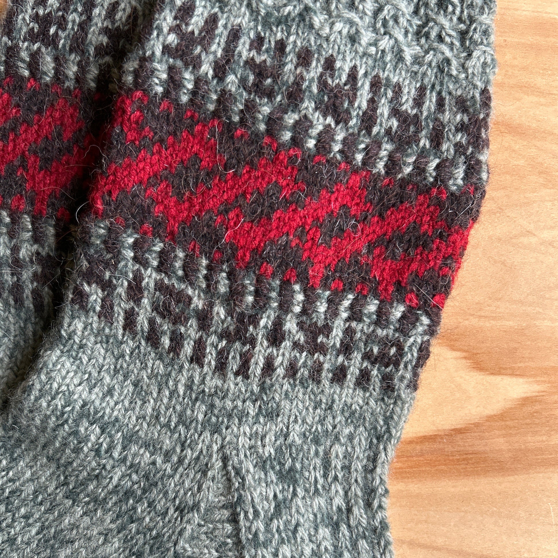 Rokām līdzeni adītas vilnas zeķes 47.-49.izm. raibas zaļa toņa zeķes ar sarkaniem un brūniem ornamentiem. Adītās pēdas garums neiestiepjot 31 cm. Stulma augstums 28 cm.