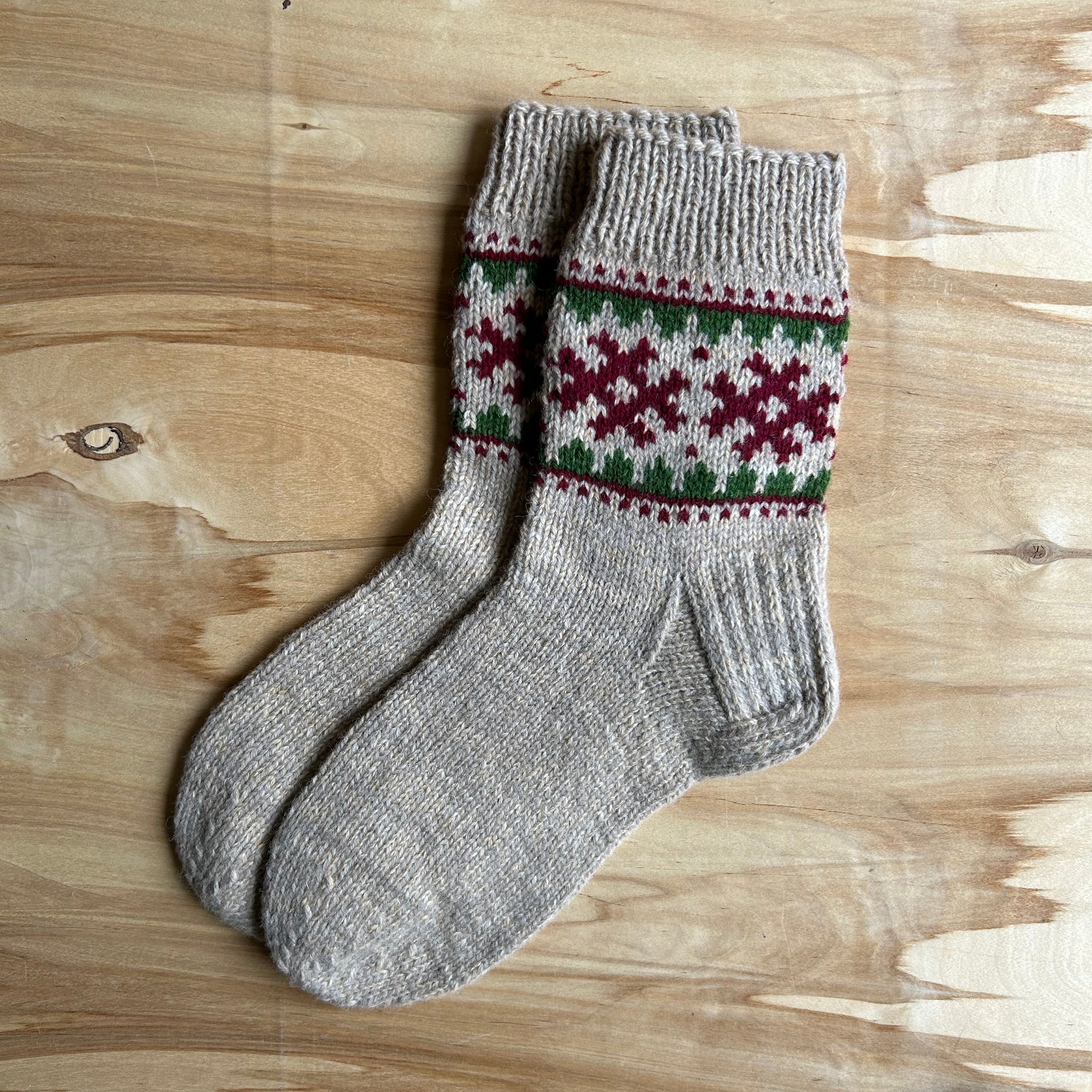 Siltās zeķes 45.-47.izm. gaiši brūnas zeķes ar sarkaniem ornamentiem (MALI 51)