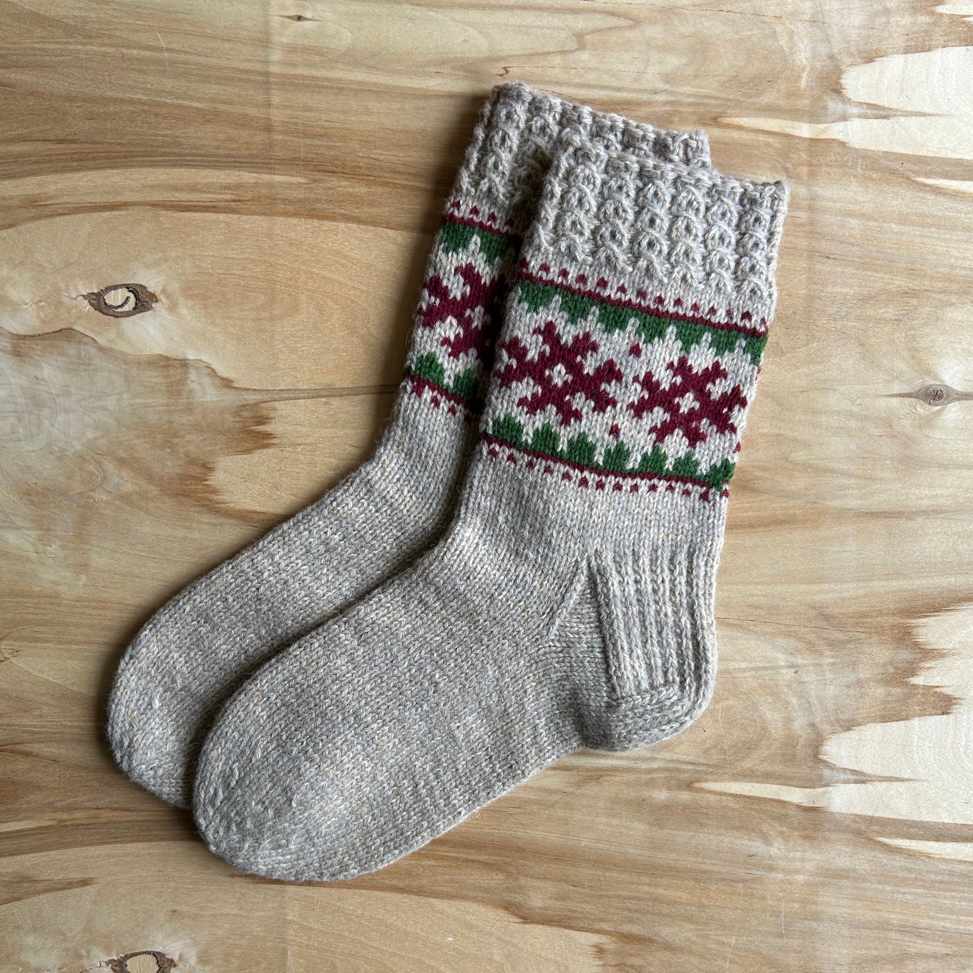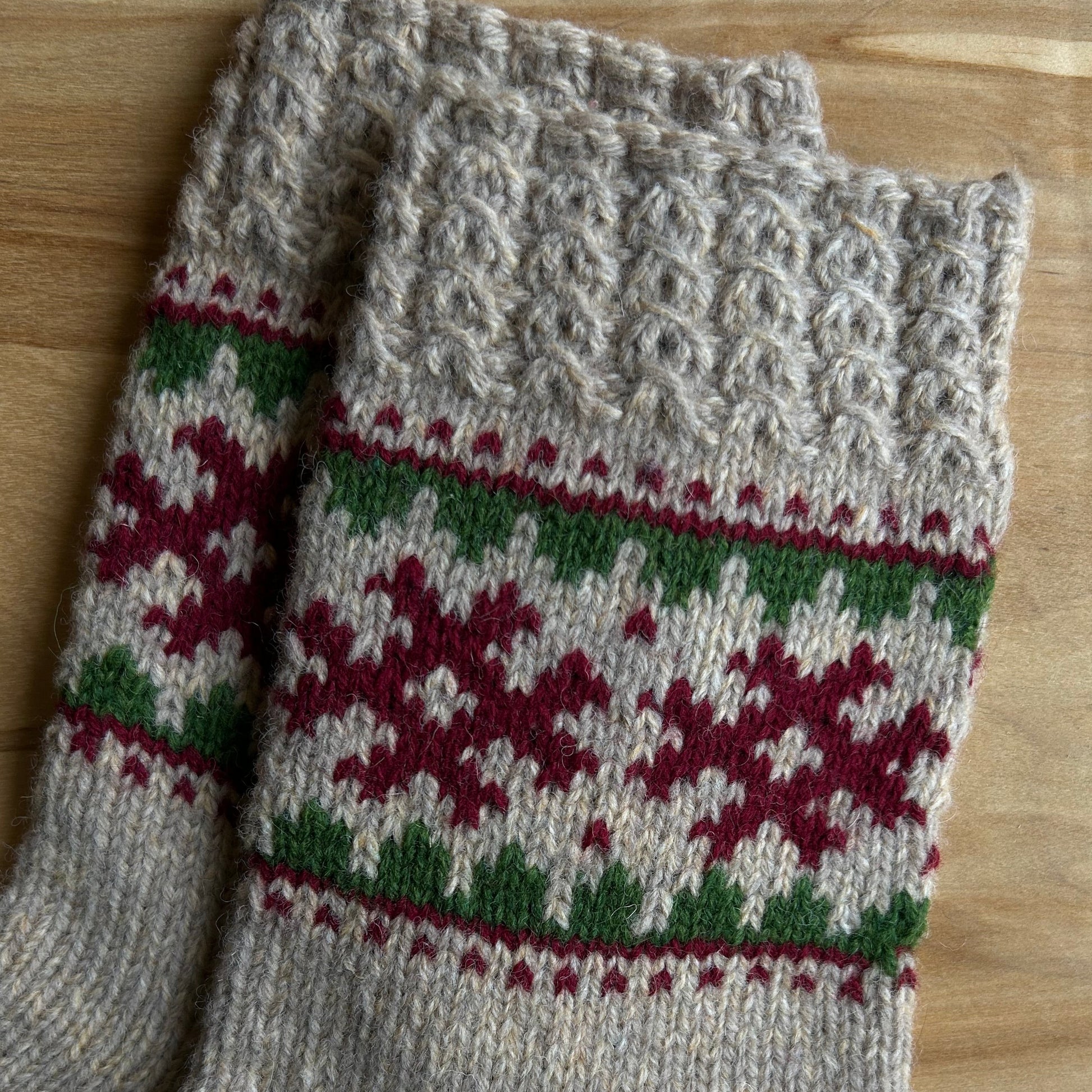 Siltās zeķes 45.-47.izm. gaiši brūnas zeķes ar sarkaniem ornamentiem (MALI 50)