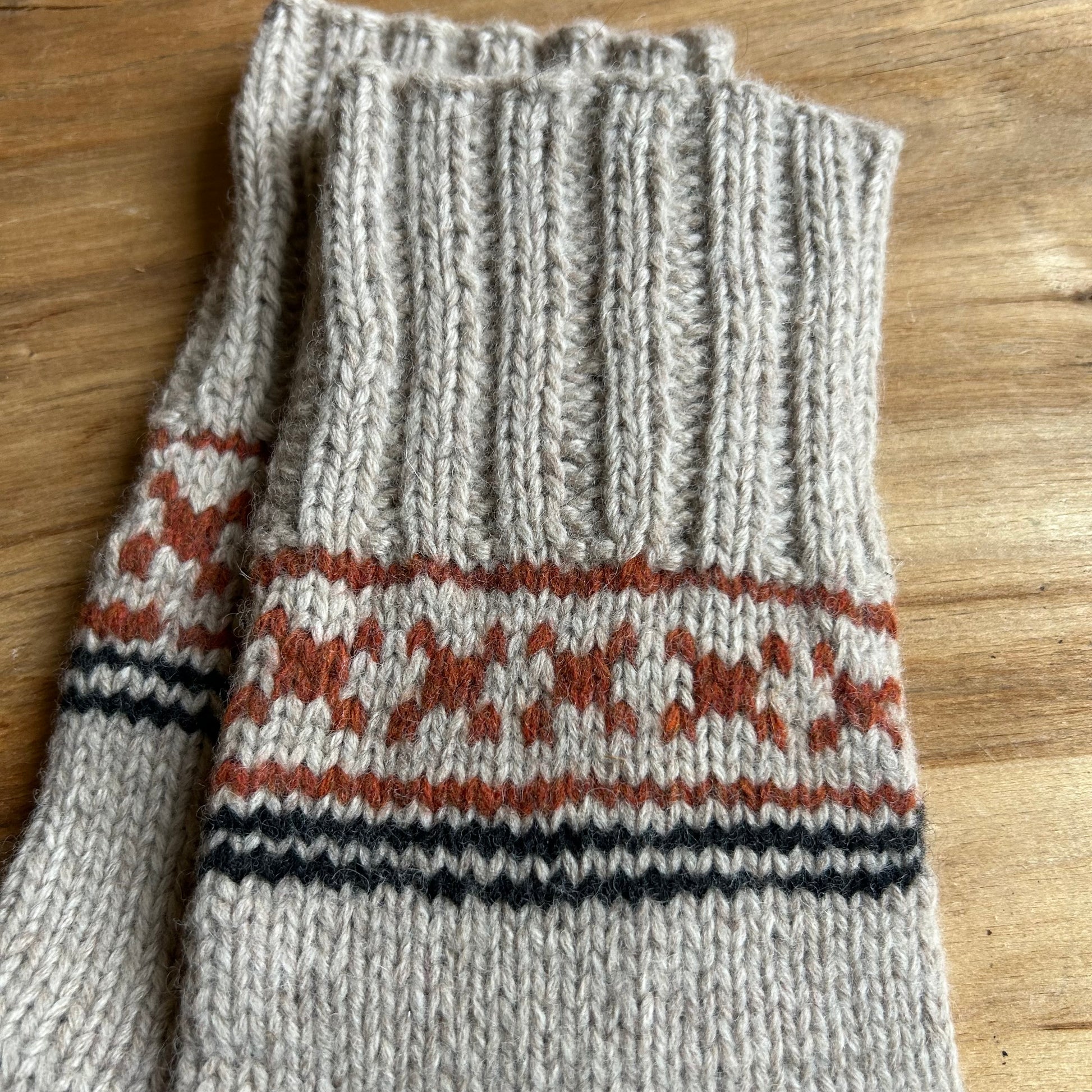 Rokām adītas vilnas zeķes gludā adījumā 42.-44.izm. gaiši pelēkā krāsā ar oranžiem ornamentiem aiz valnīša daļas. Adītās pēdas garums neiestiepjot 27cm. Stulma augstums 20 cm.