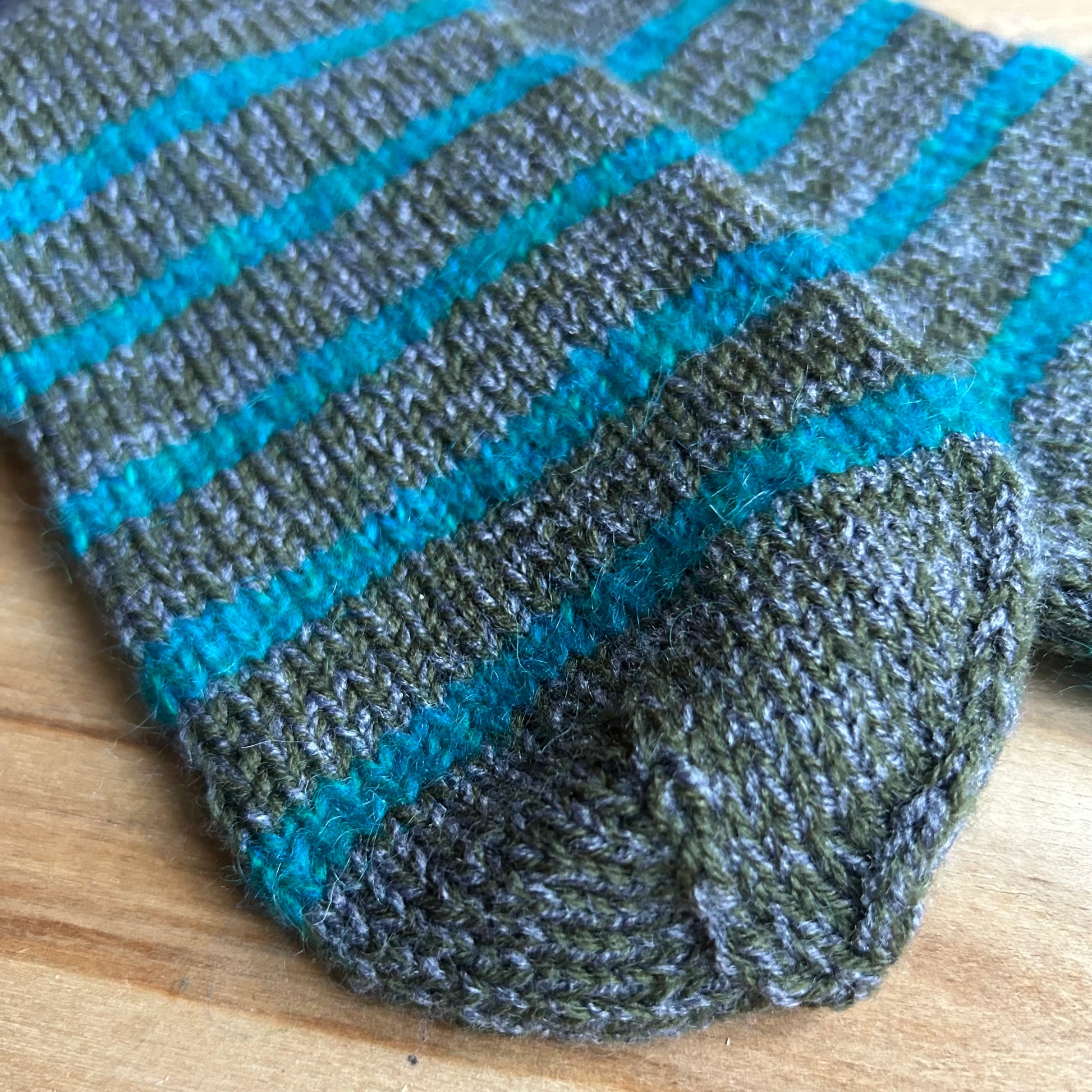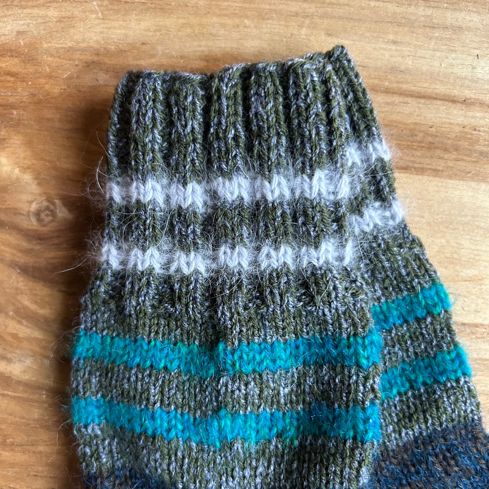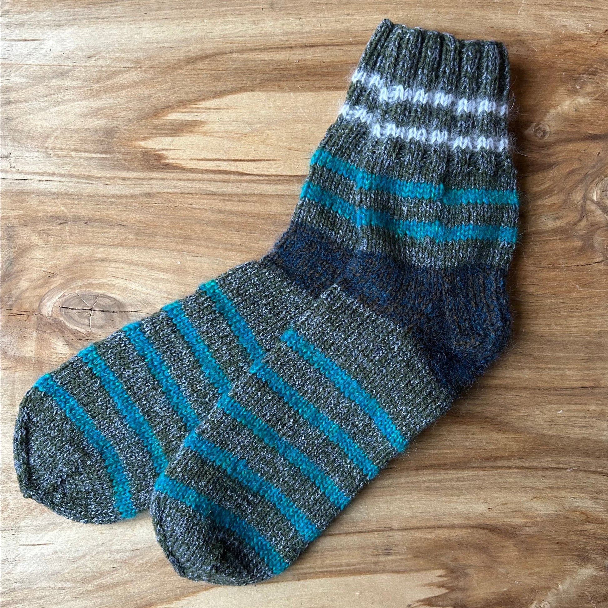 Rokām adītas siltās zeķes vīriešiem tumši pelēkas zilām un baltām svītrām 39.-41. izm. Stulma augstums ~13 cm / adītās pēdas garums neiestiepjot ~25 cm.