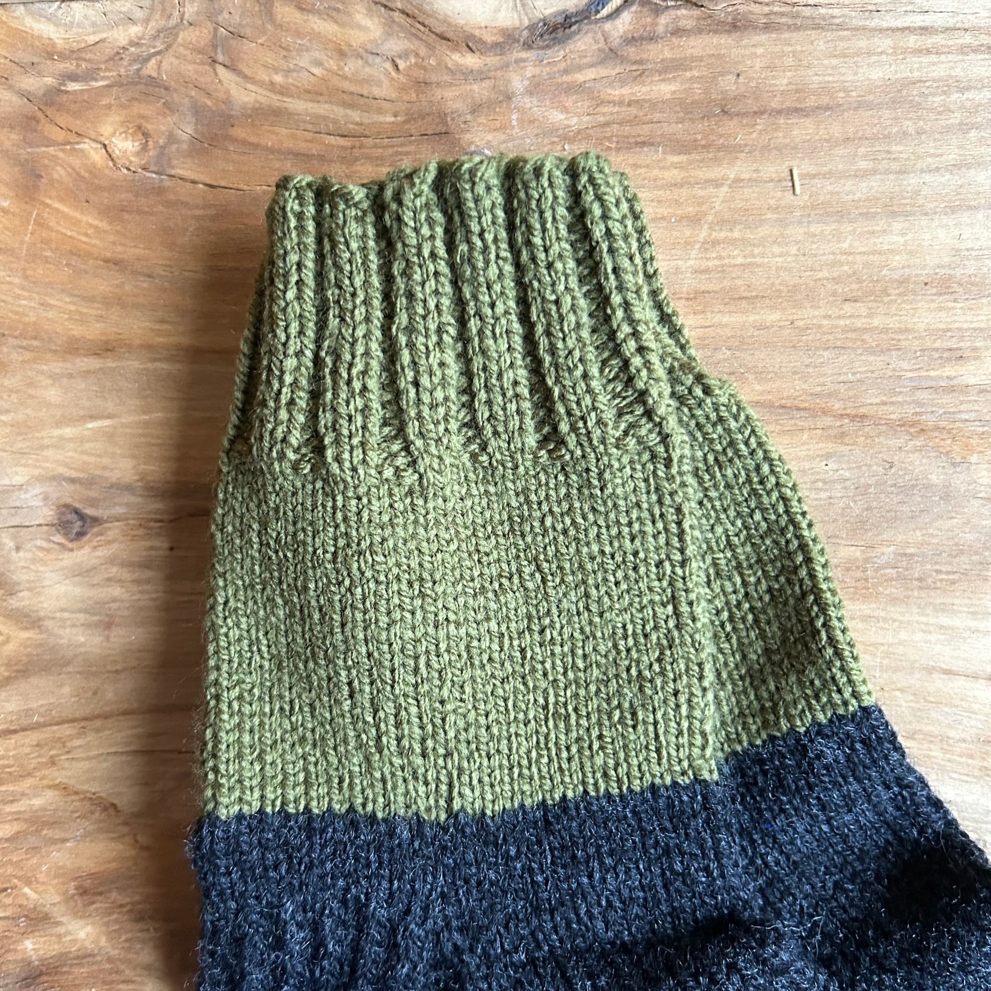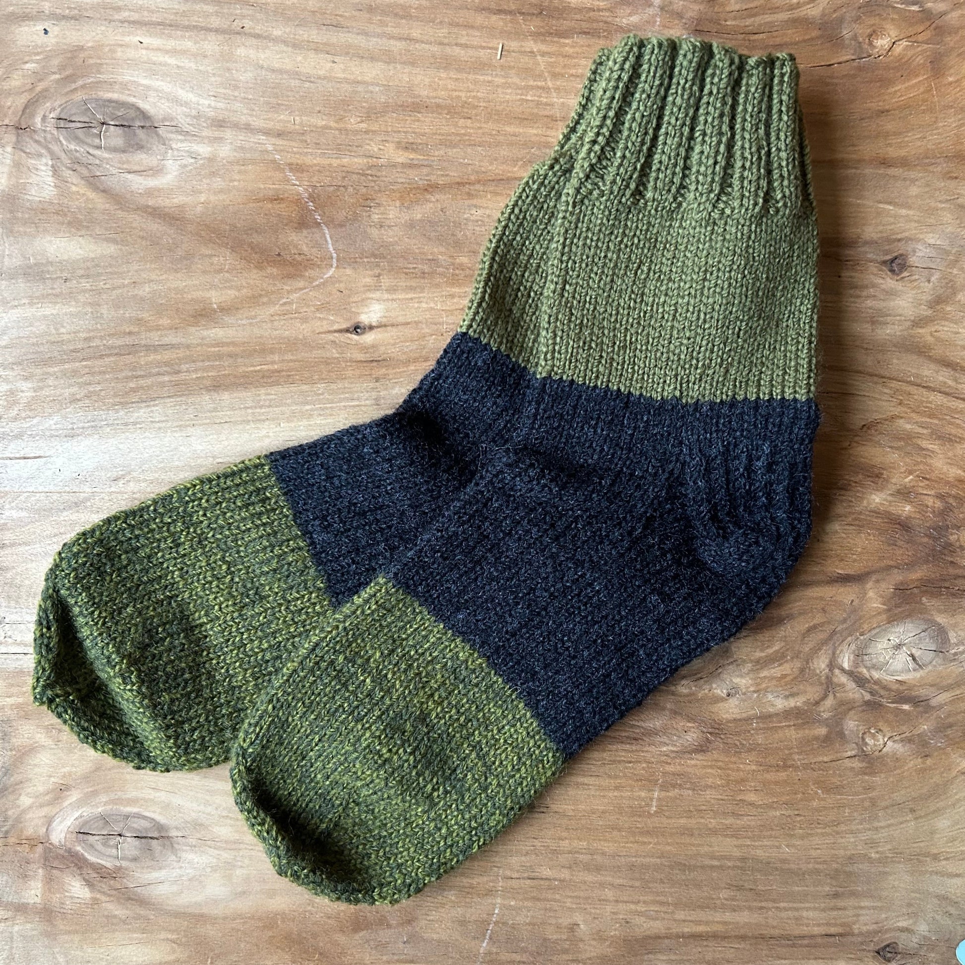 Rokām adītas siltās zeķes vīriešiem sūnu zaļas ar tumši pelēku joslu papēža daļā 43.-45. izm. Stulma augstums ~15 cm / adītās pēdas garums neiestiepjot ~28 cm.