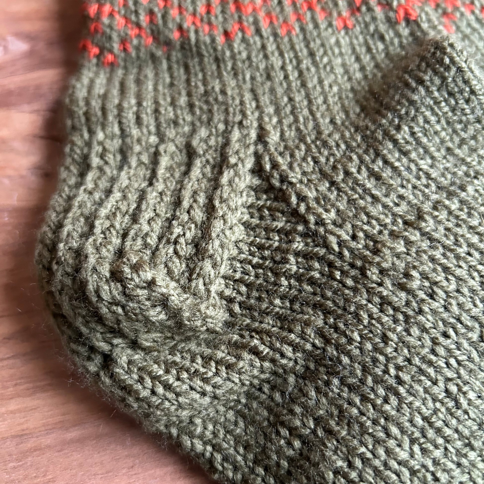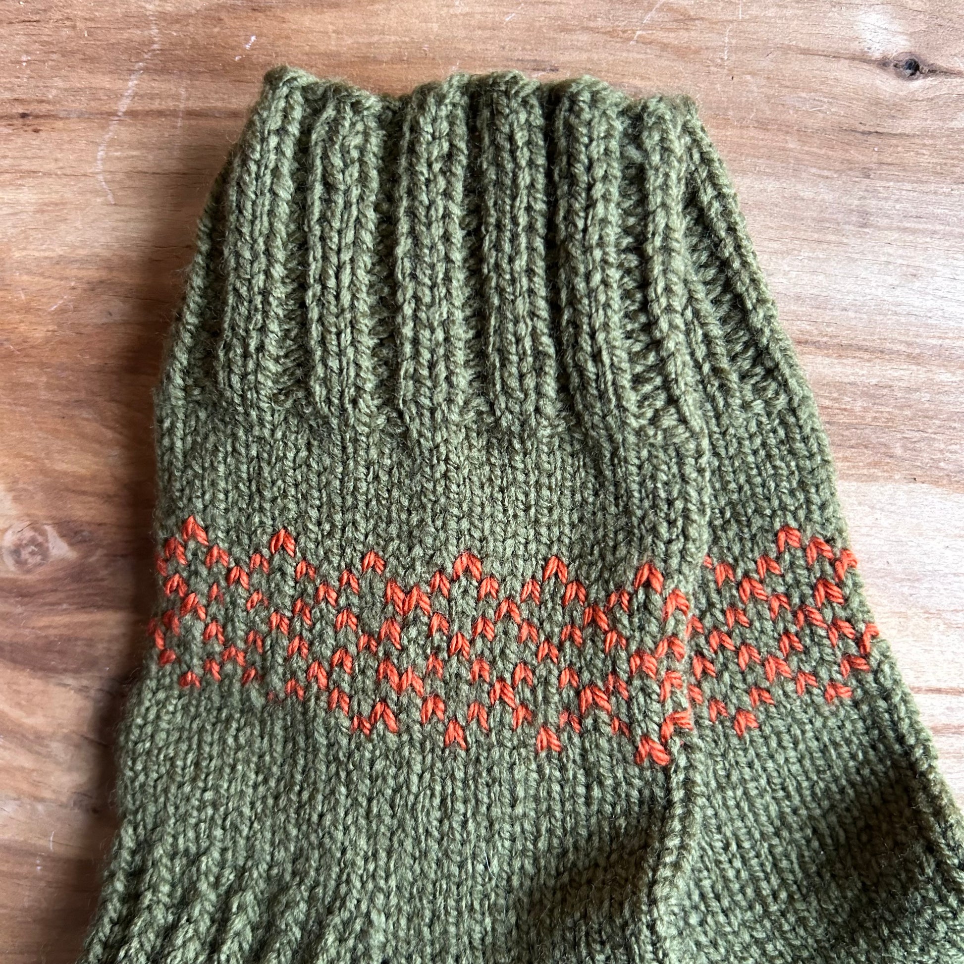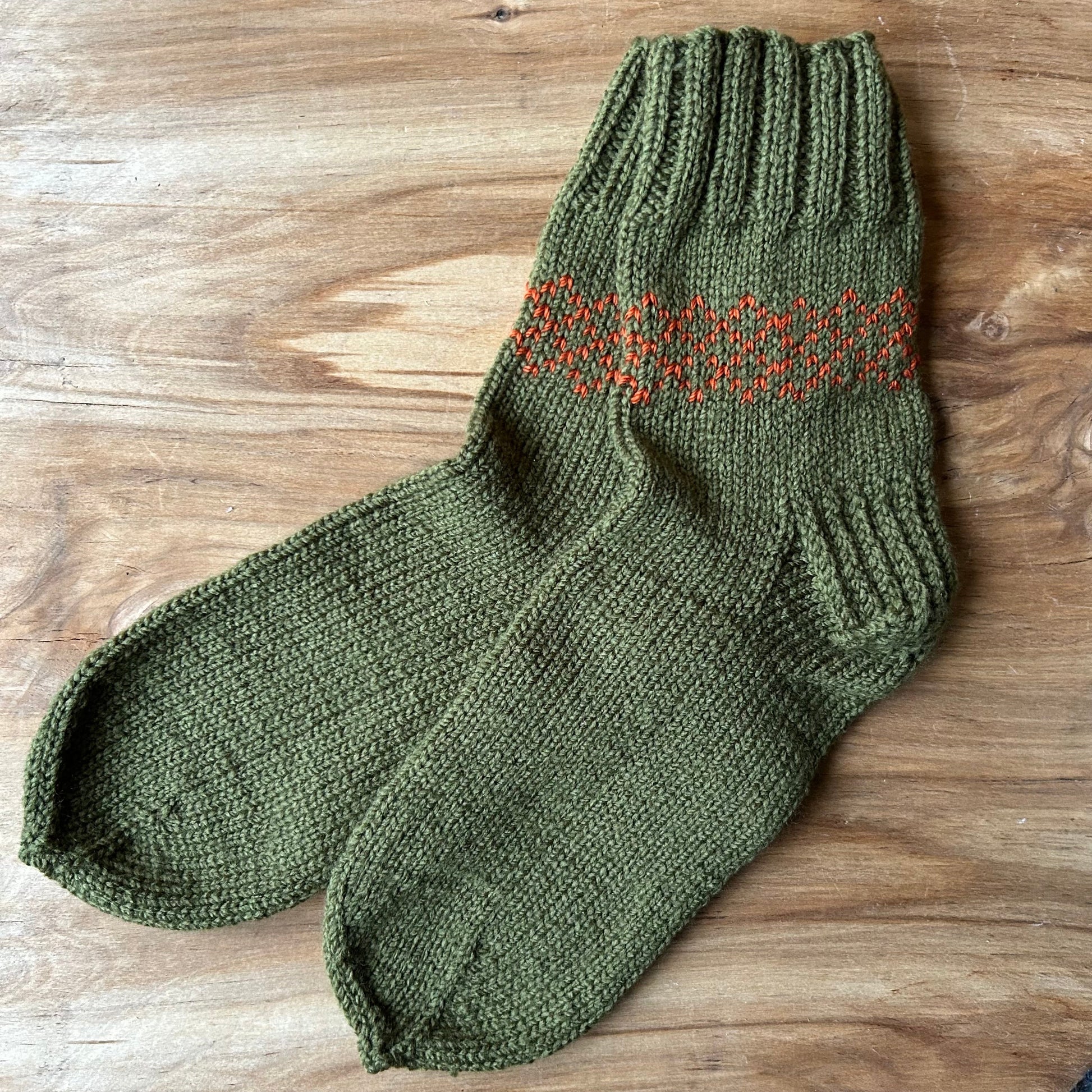 Rokām adītas siltās zeķes vīriešiem haki zaļas ar nelielu oranžu rakstiņu 42.-44. izm. Stulma augstums ~15 cm / adītās pēdas garums neiestiepjot ~27 cm.