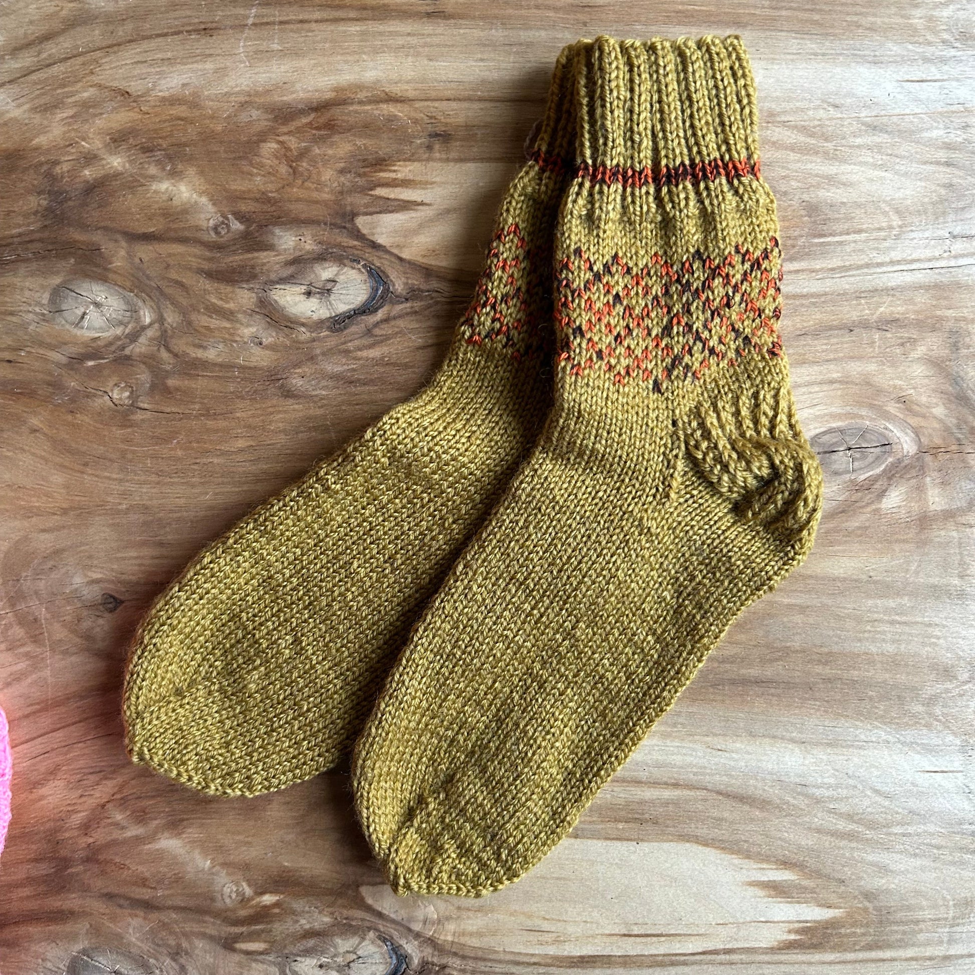 Rokām adītas siltās zeķes vīriešiem sinepju dzeltenas ar nelieliem brūniem rakstiņiem 43.-45. izm. Stulma augstums ~14 cm / adītās pēdas garums neiestiepjot ~28 cm.