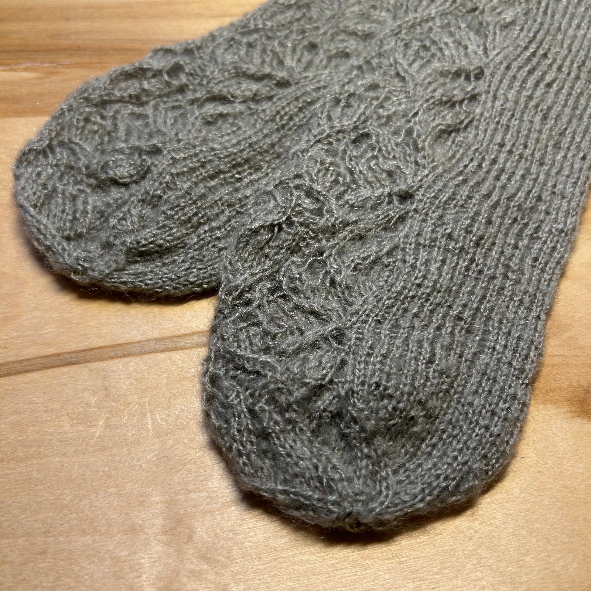 Rokām mežģīņu rakstā adītas gaiši pelēkas krāsas siltās zeķes 40.-42. izm. Stulma augstums ~11 cm / pēdas garums ~26cm.