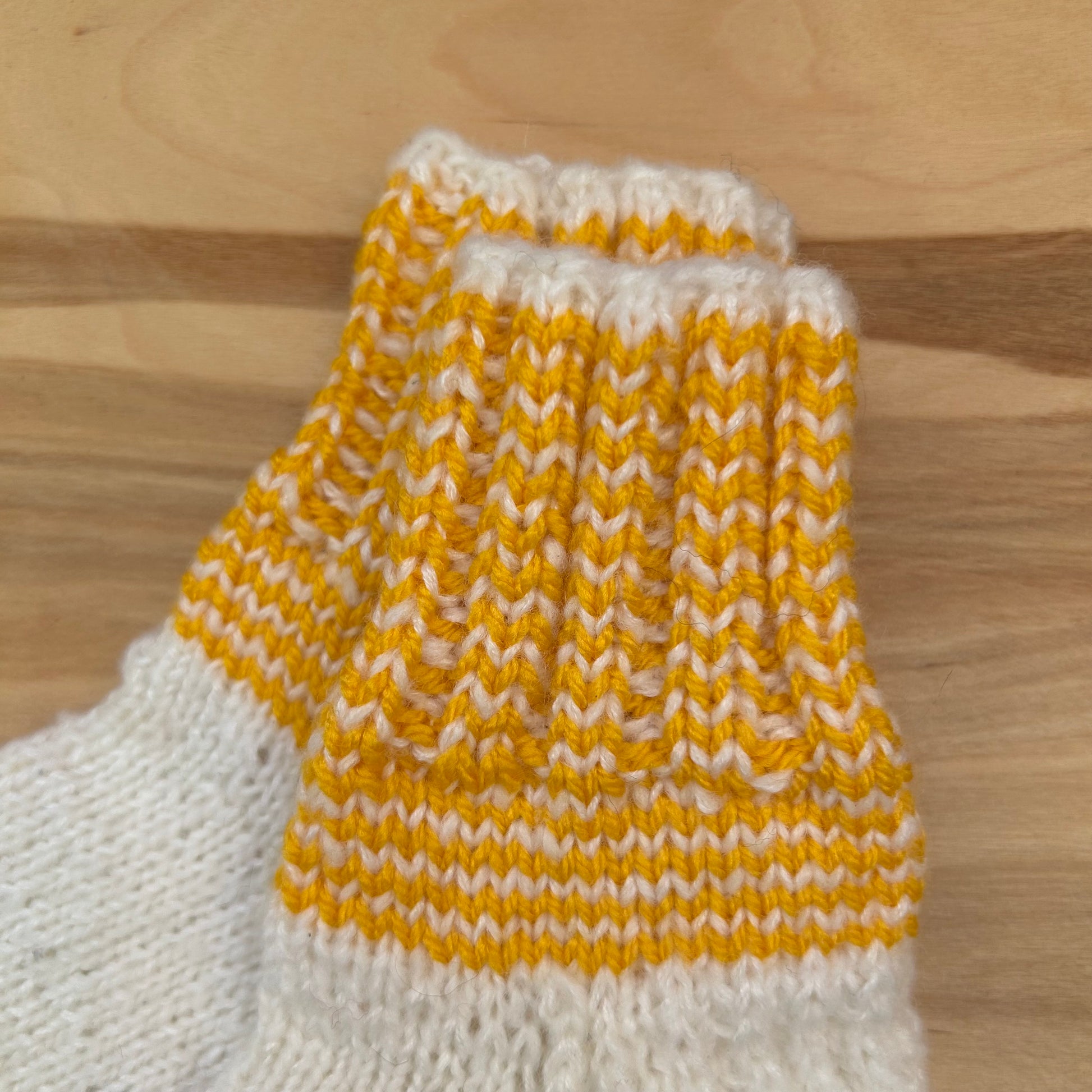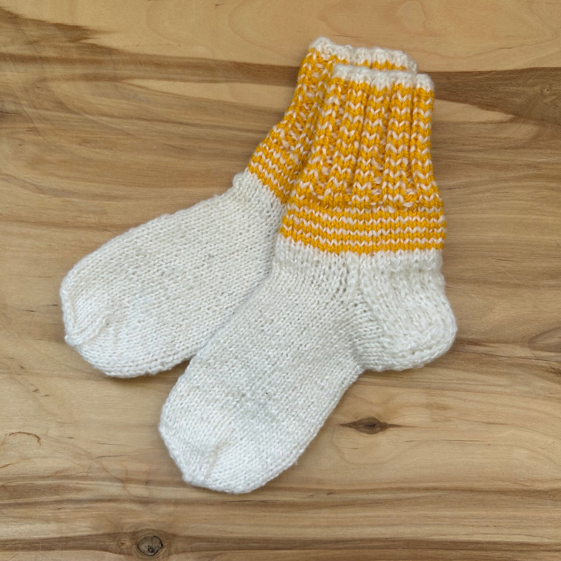 Rokām adītas baltas siltās zeķes ar dzeltenu stulmu 24.-26.izm. Stulma augstums ~8 cm / pēdas garums ~15 cm.