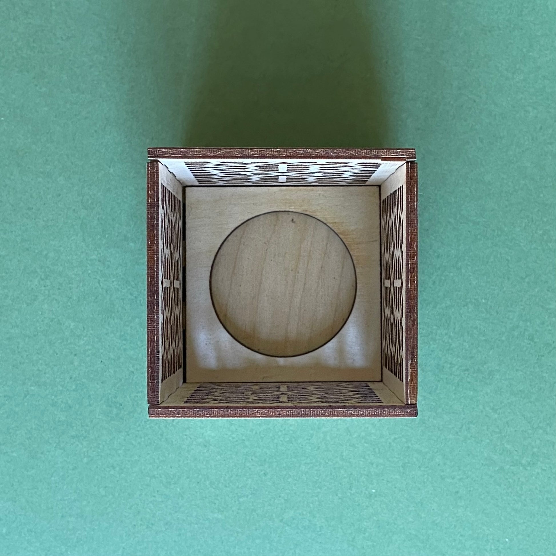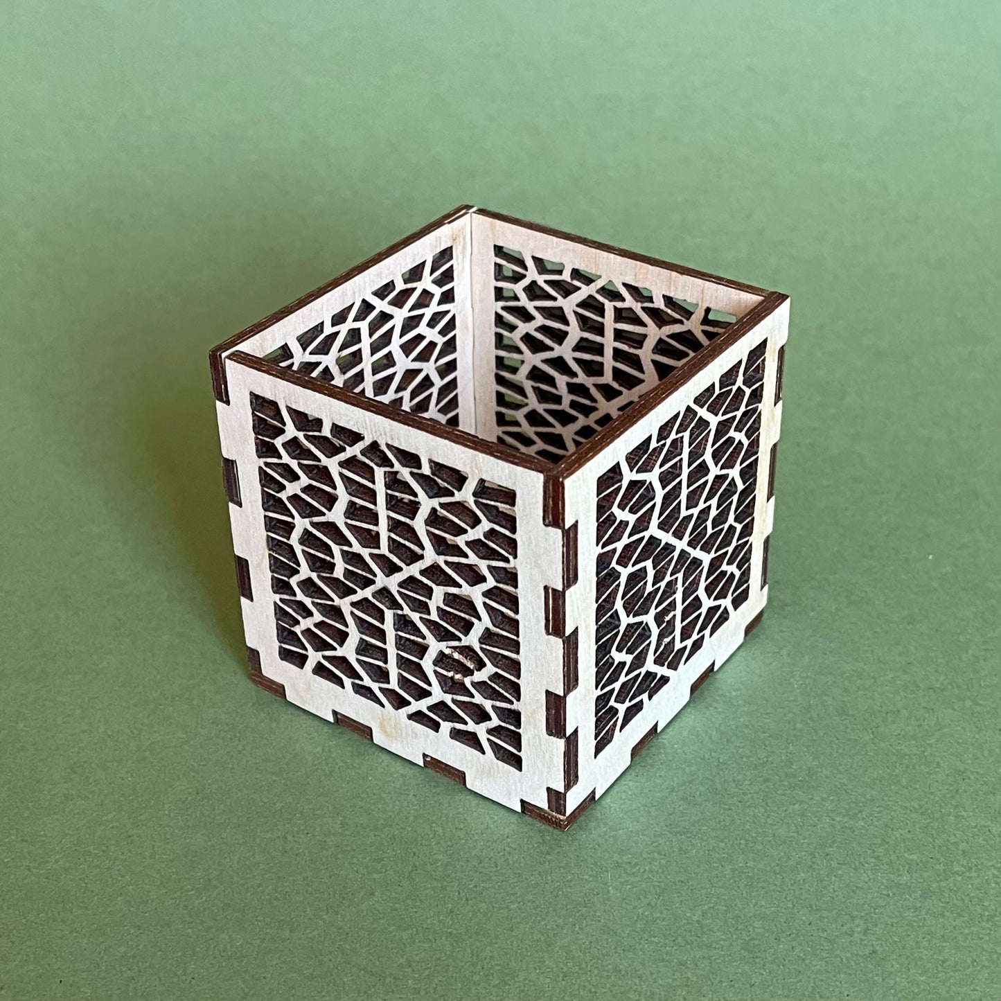 Kuba formas svečturis tējas svecēm ar izfrēzētu rakstu sānu virsmās. Svečtura augstums 6 cm, platums 6 cm, garums 6 cm, svecītei paredzētā vieta 4 cm diametrā.