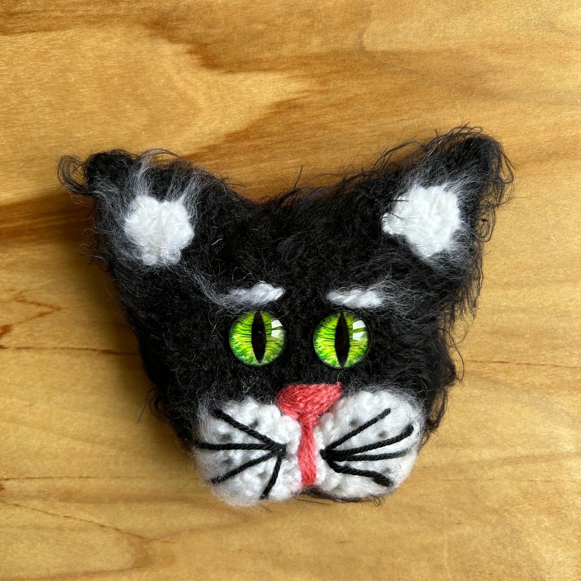 Tamborēta broša - Tamborrūķa meistardarbs - roku darbs, ar sirsnību un rūpību tamborēta broša "Kaķa galva", melnā krāsā ar baltas dzijas purniņu un zaļām acīm, ūsām. Izgatavots no mīkstas, pūkainas dzijas, patīkama pieskārienam un droši stiprināma pie apģērba, šalles vai somas. Izmērs 9x11x3cm