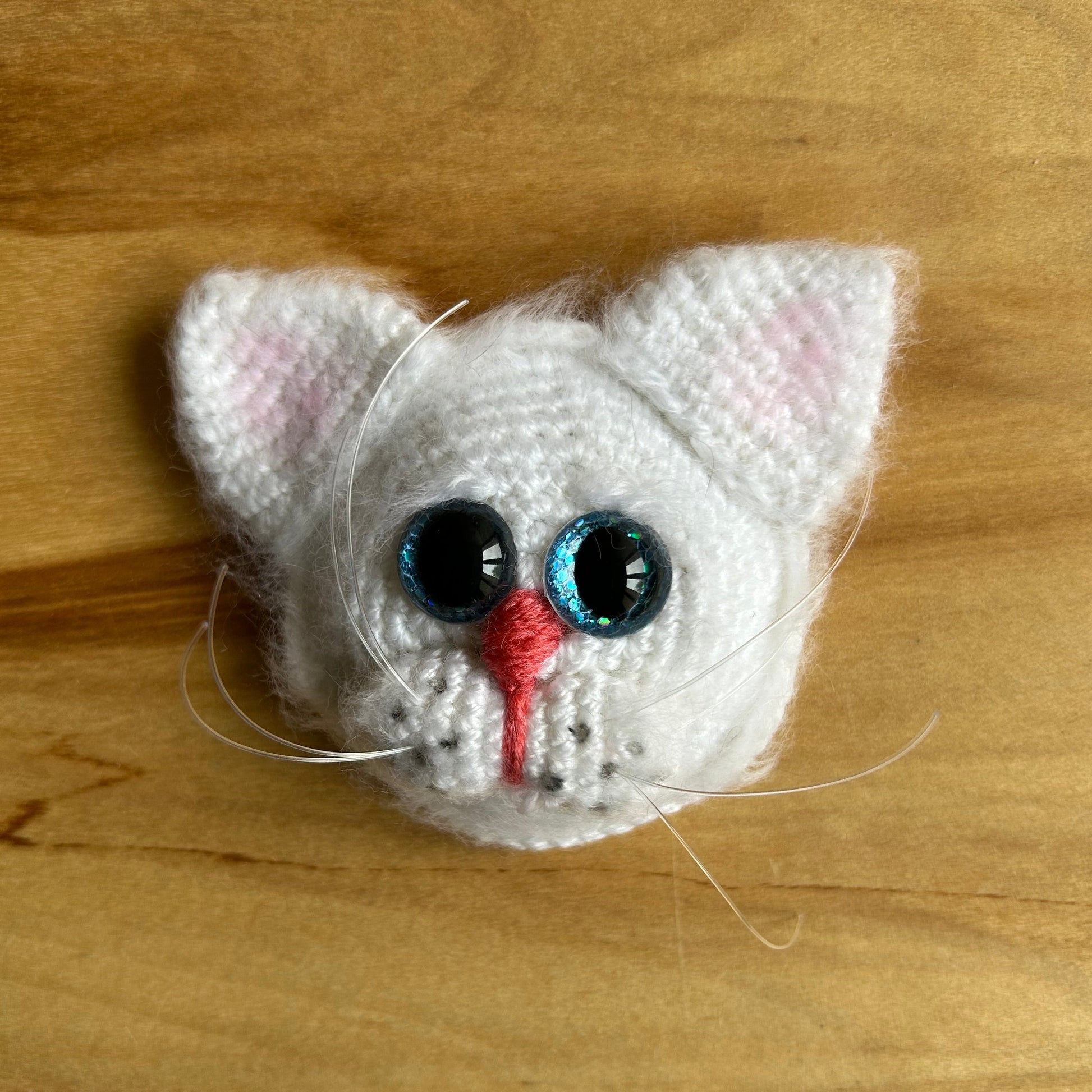 Tamborēta broša - Tamborrūķa meistardarbs - roku darbs, ar sirsnību un rūpību tamborēta broša "Kaķa galva", baltā krāsā, maigi rozā austiņām, ar baltas dzijas purniņu un zilām acīm, ūsām. Izgatavots no mīkstas, pūkainas dzijas, patīkama pieskārienam un droši stiprināma pie apģērba, šalles vai somas. Izmērs 8x9x3cm