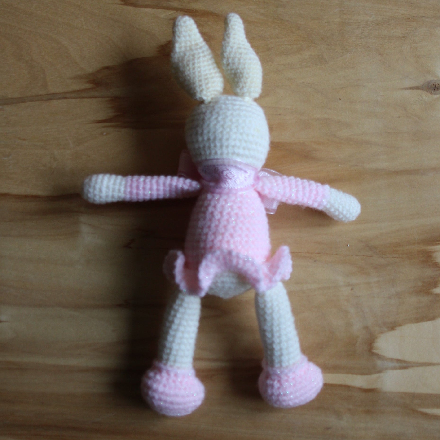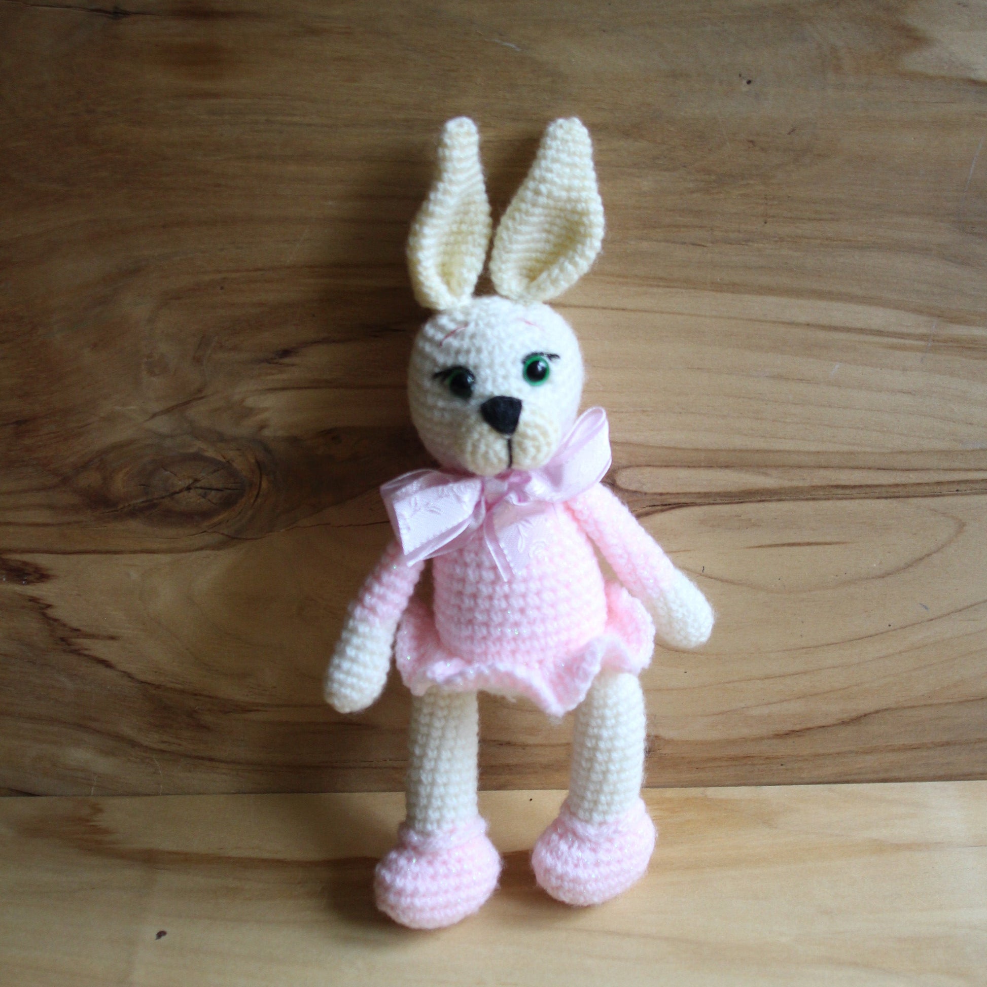 No ļoti mīkstas dzijas rokām tamborēta gaiši brūna zaķenīte ar maigi rozā kleitiņu un gaiši rozā banti ap kaklu. Izmērs ~28x9x9 cm.