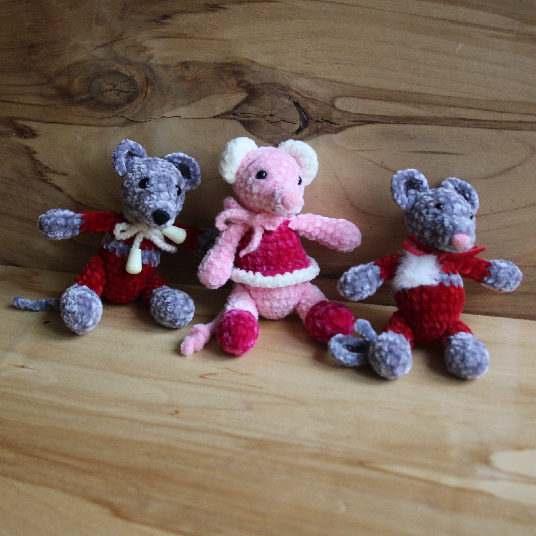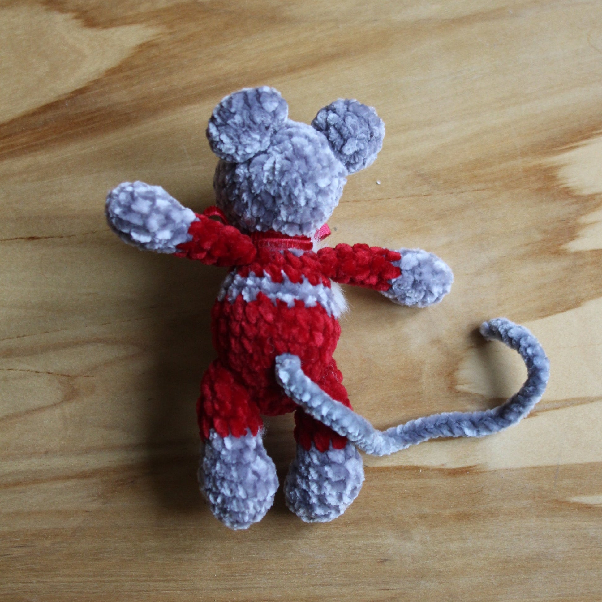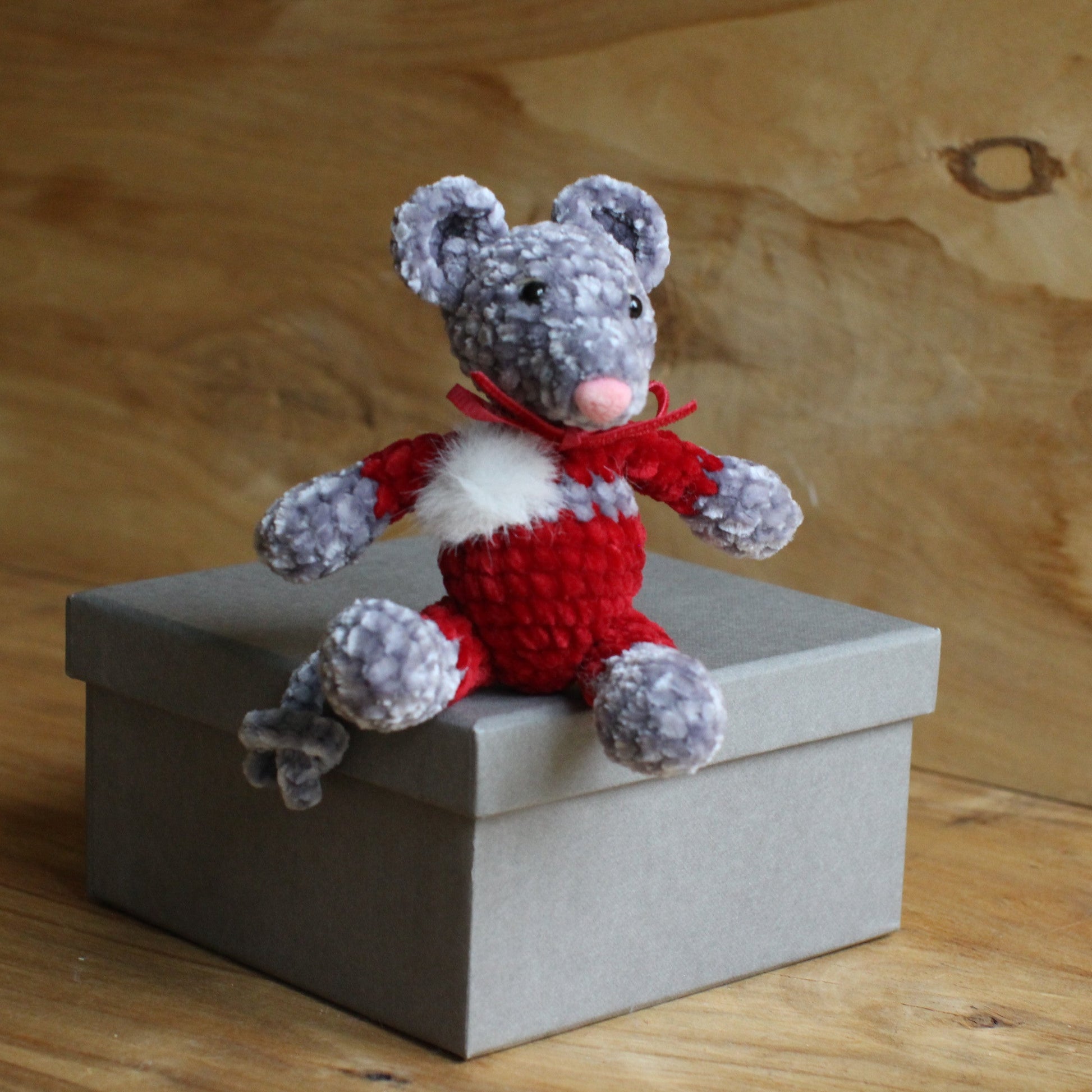 No ļoti mīkstas dzijas rokām tamborēta pelēka pelīte sarkanā kostīmiņā ar baltu pūciņu ap kaklu. Izmērs ~16x9x9 cm.