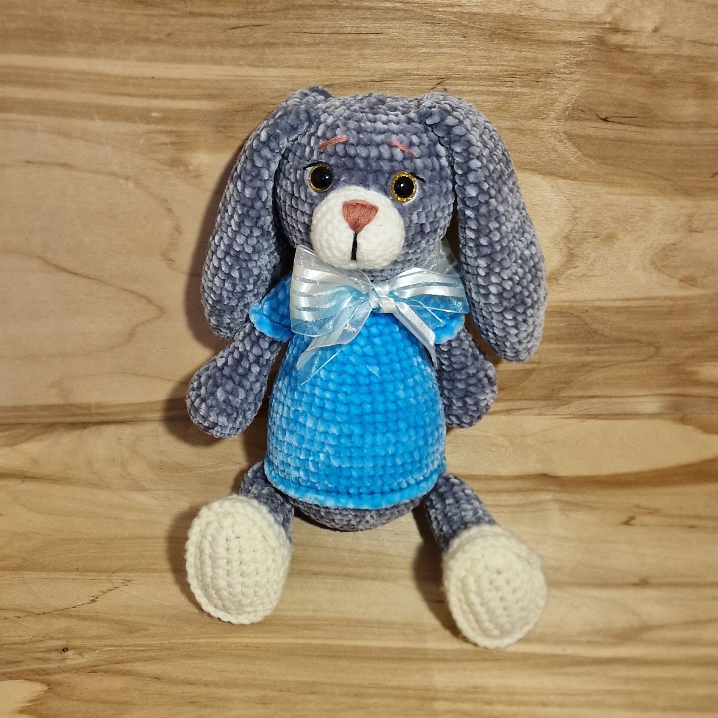 No ļoti mīkstas dzijas rokām tamborēta rotaļlieta - zaķis. Pelēks pamats, gaiši zils krekliņš, dabīgi baltas kurpītes, ap kaklu gaiši svītrota bante. Izmērs ar nolaistām ausīm (~28x13 cm).