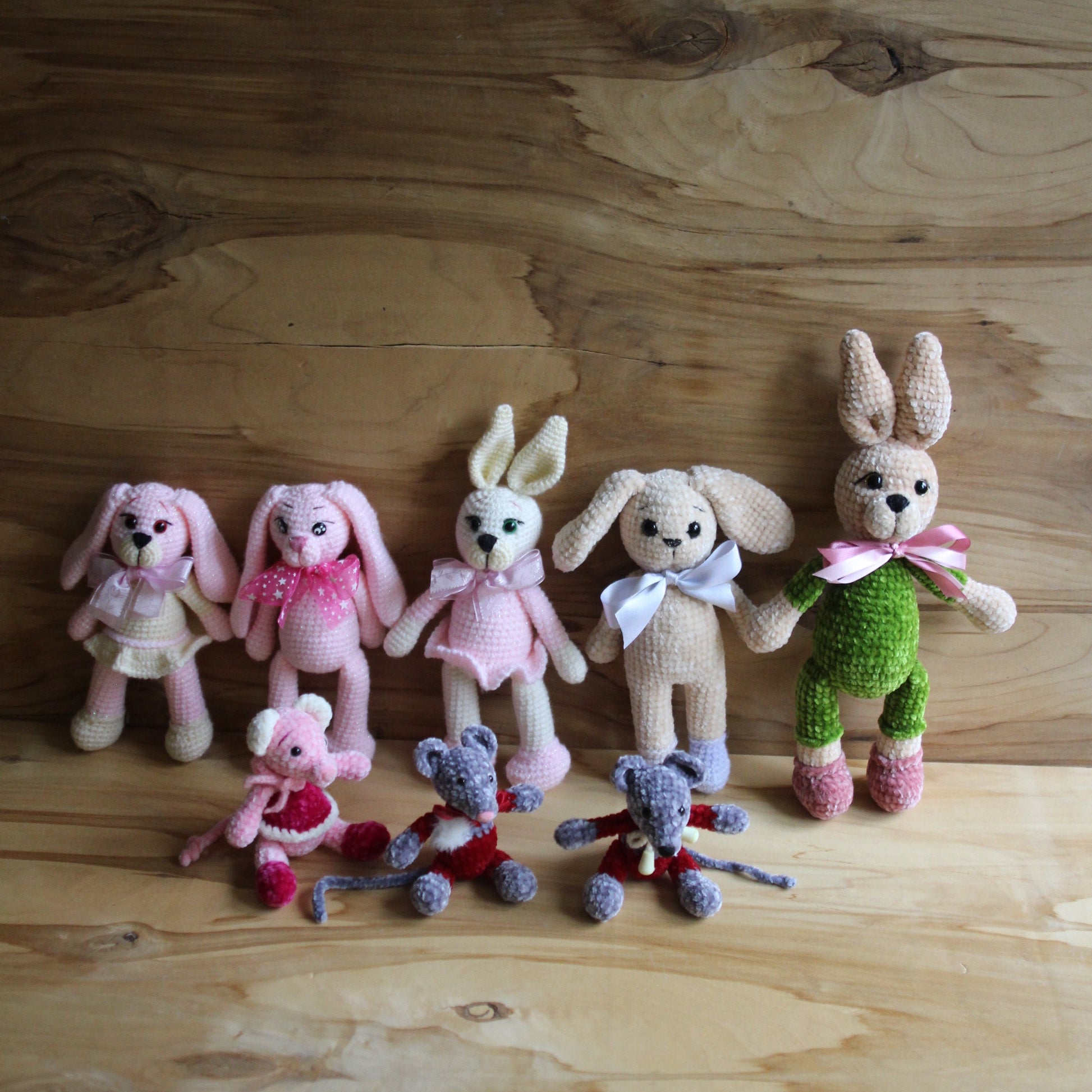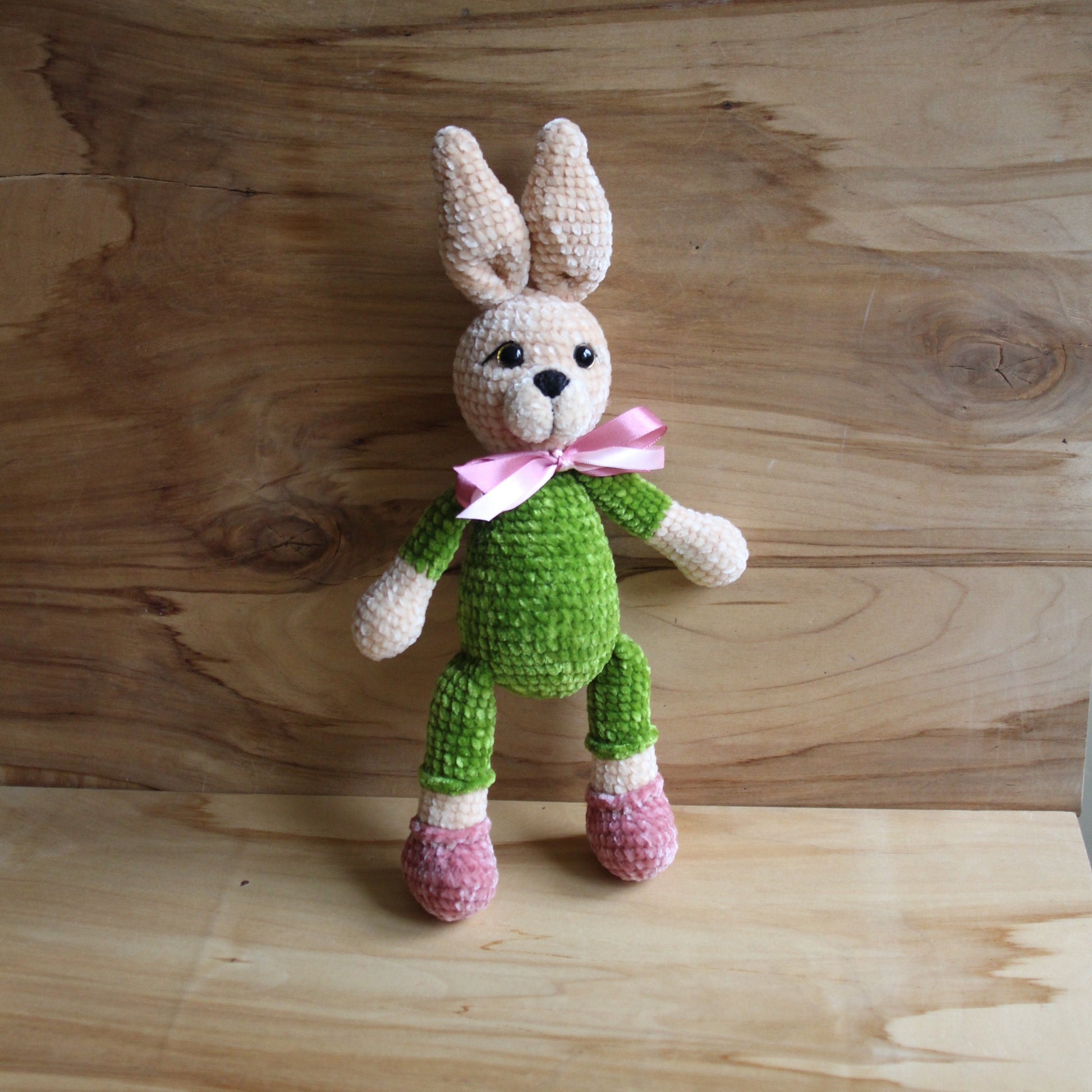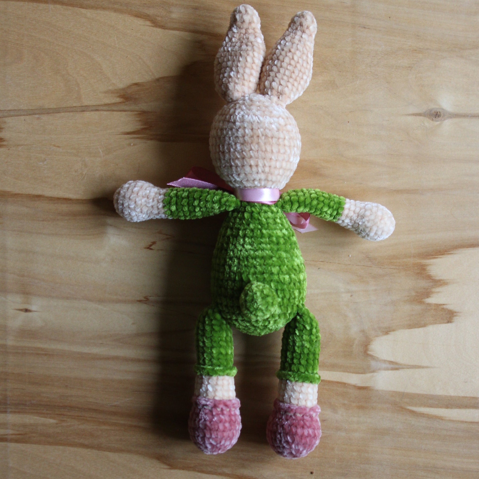 No ļoti mīkstas dzijas rokām tamborēts zaķis koši zaļā tērpā, rozā zeķītēm un rozā banti ap kaklu. Izmērs ~35 x 13x13 cm.