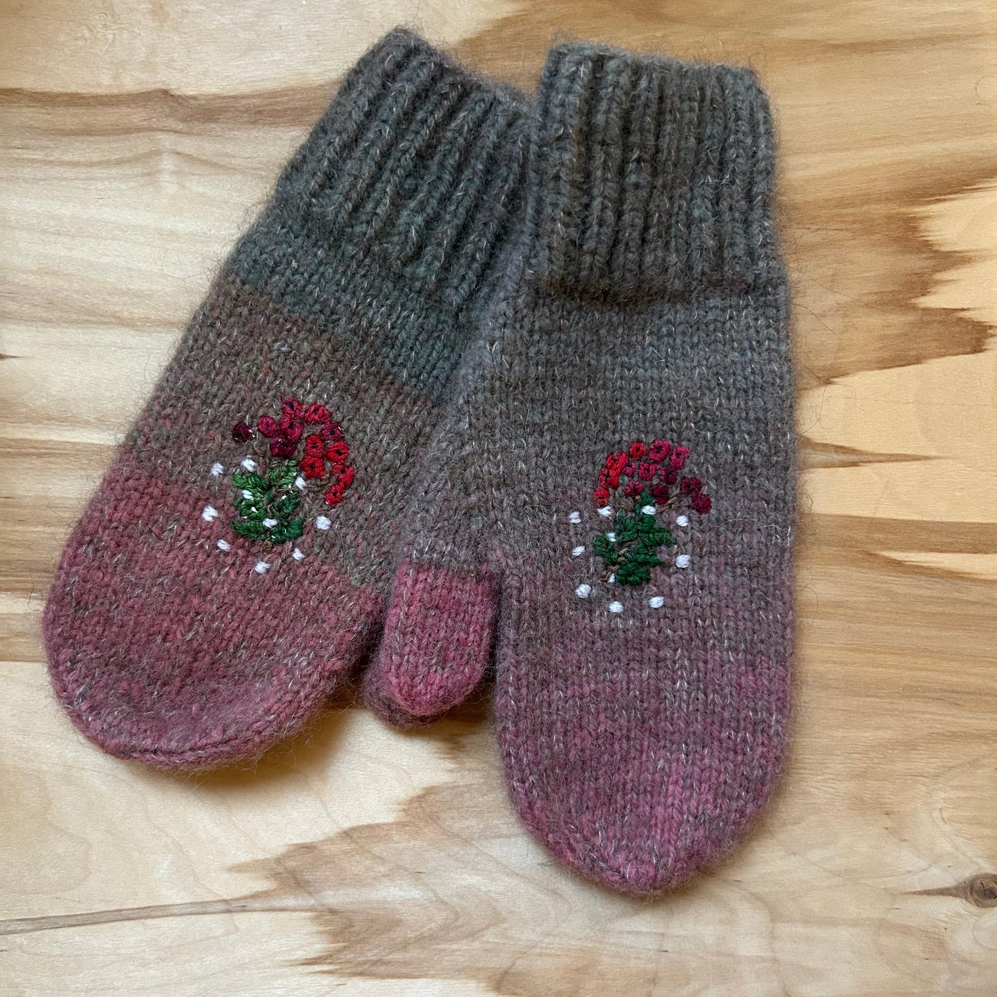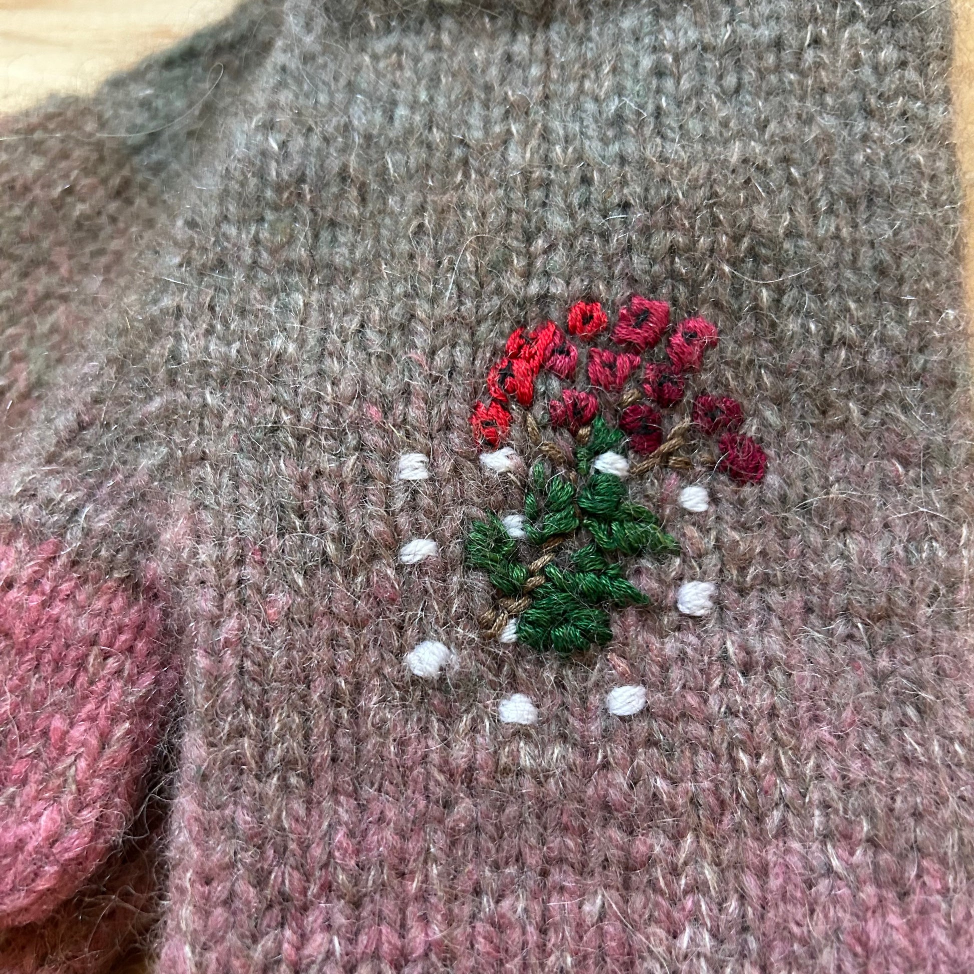 Rokām adīti brūni rozā dūraiņi ar uzšūtu zīmējumu uz katra cimda virspuses.