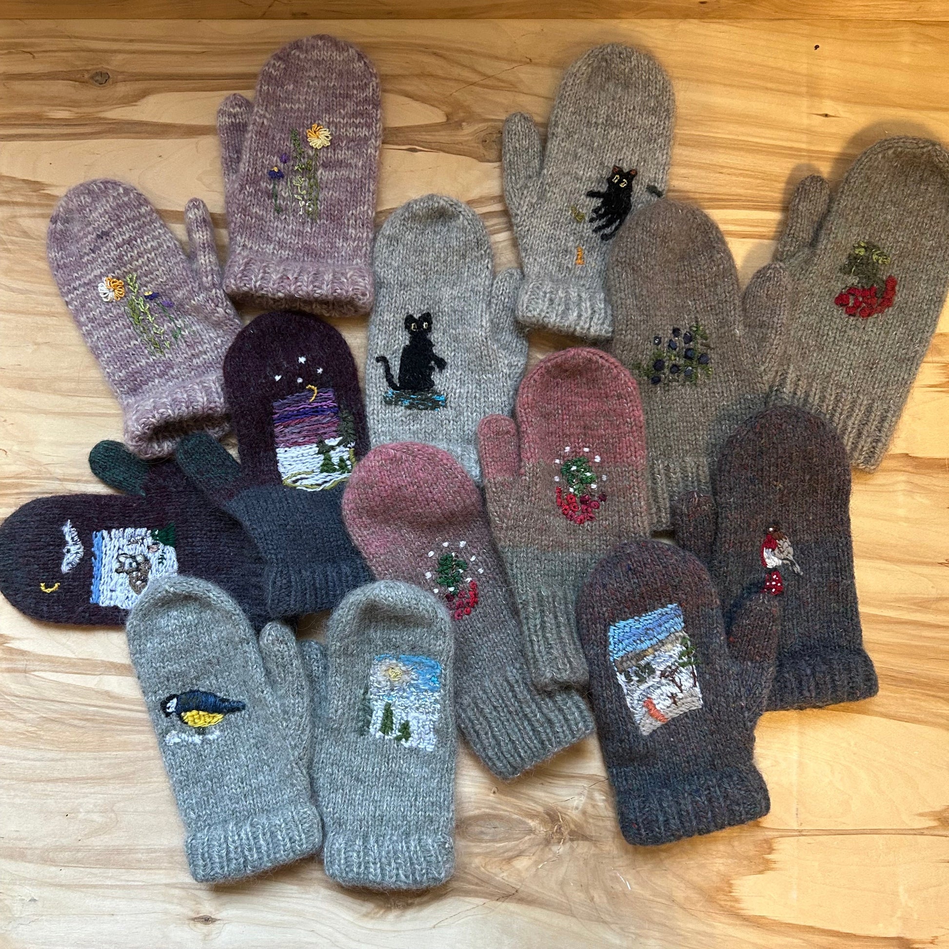Uz tiem dzīvo ogas, ziedi, kaķi, putni un ziemas ainavas. Katrs pāris ir kā maza pasaka, izšūta uz cimdiņa.