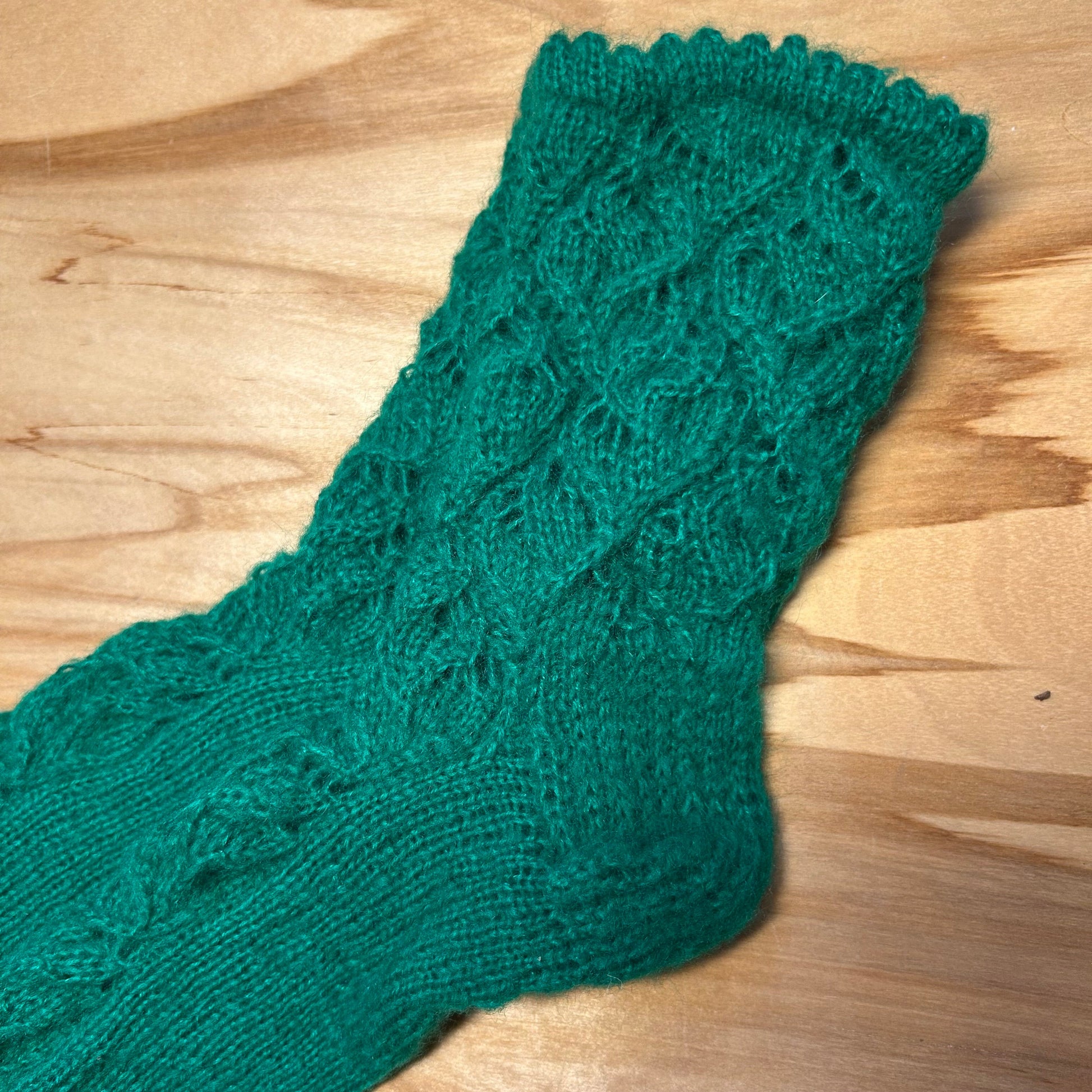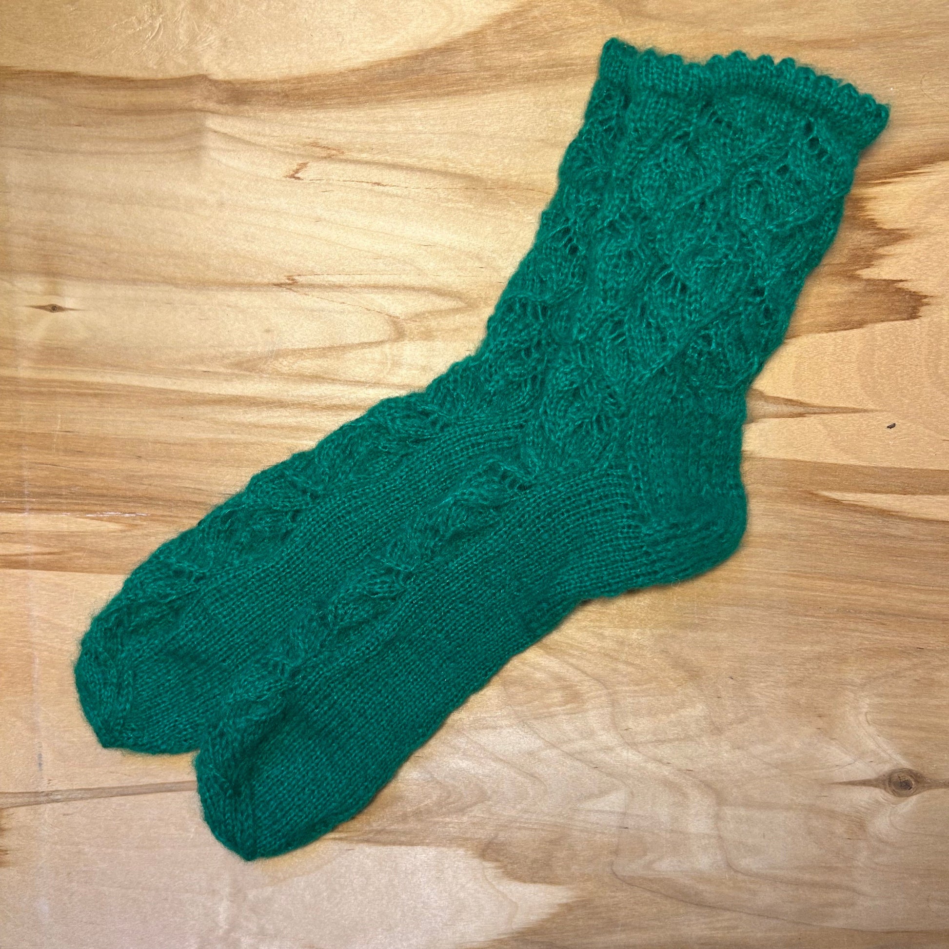 Tumši zaļas krāsas mežģīņu adījuma siltās zeķes 38.-40. izm. (SITĒ 42)