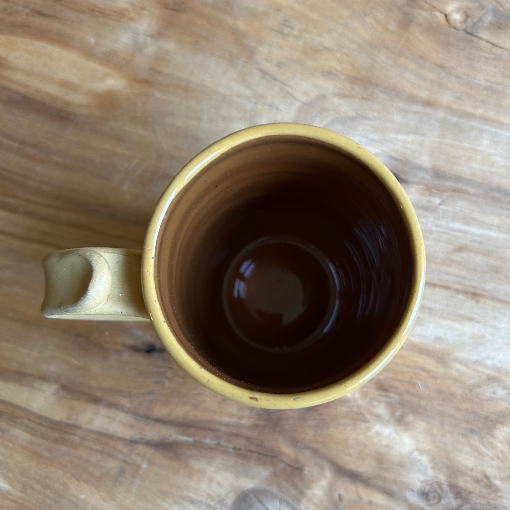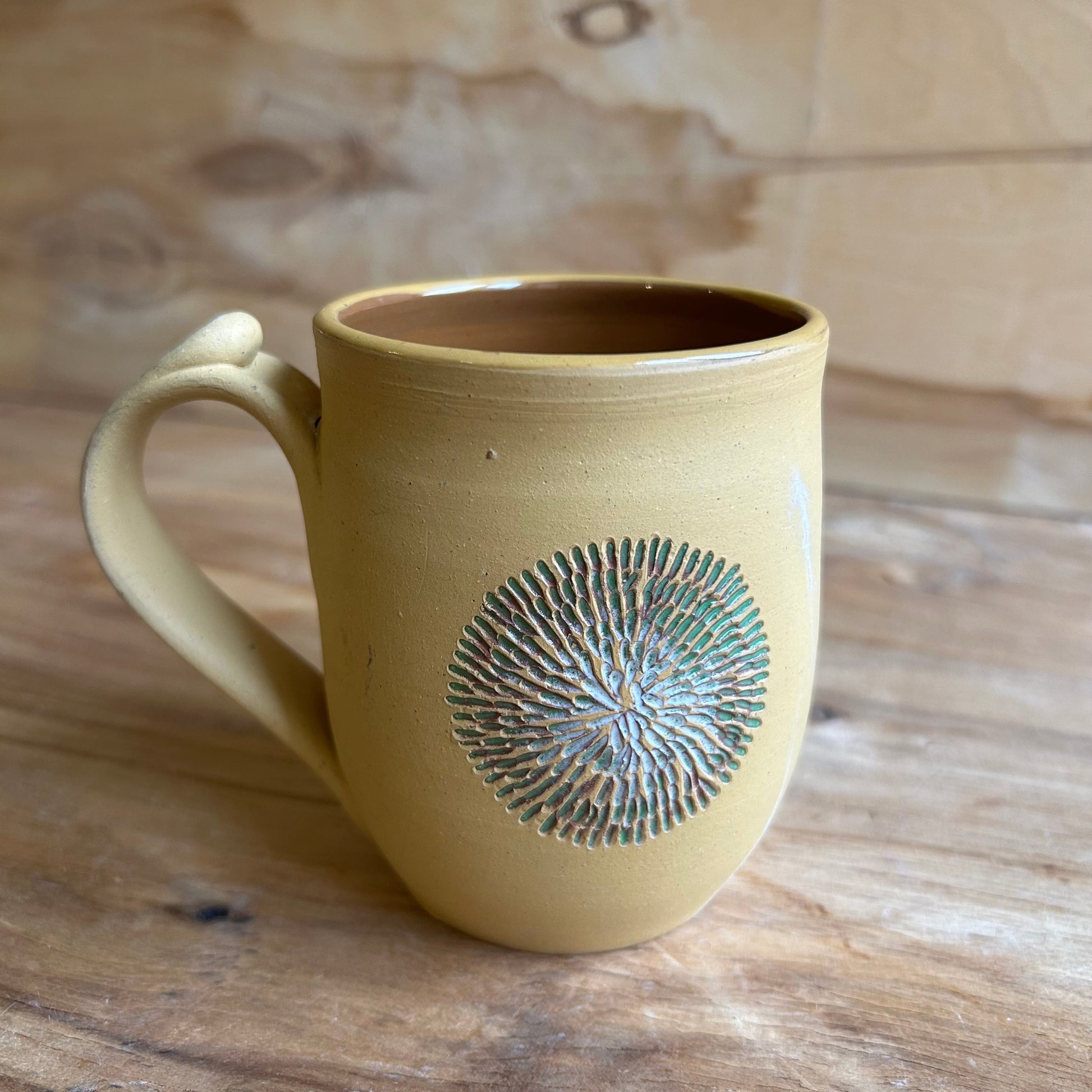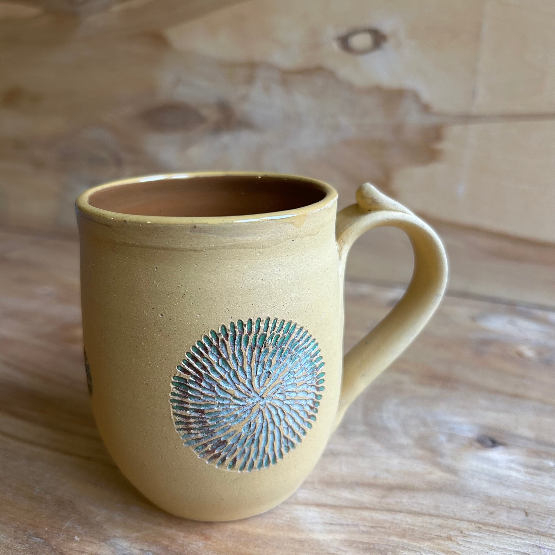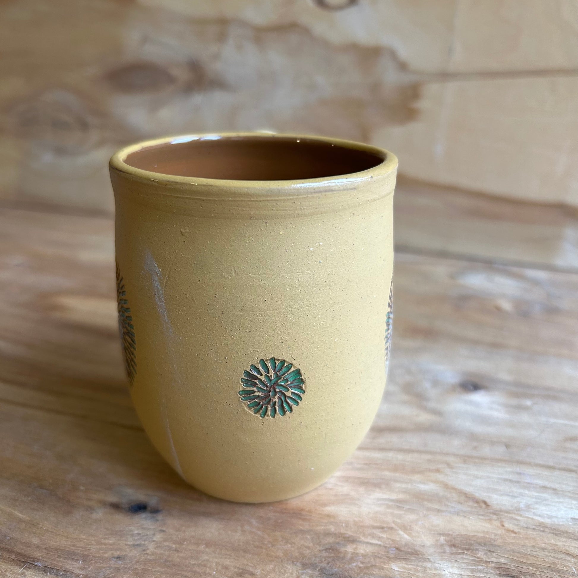 Rokām veidota dzeltena māla krūze ar brūnu glazētu iekšpusi, un zaļiem skrāpziedu ornamentiem.