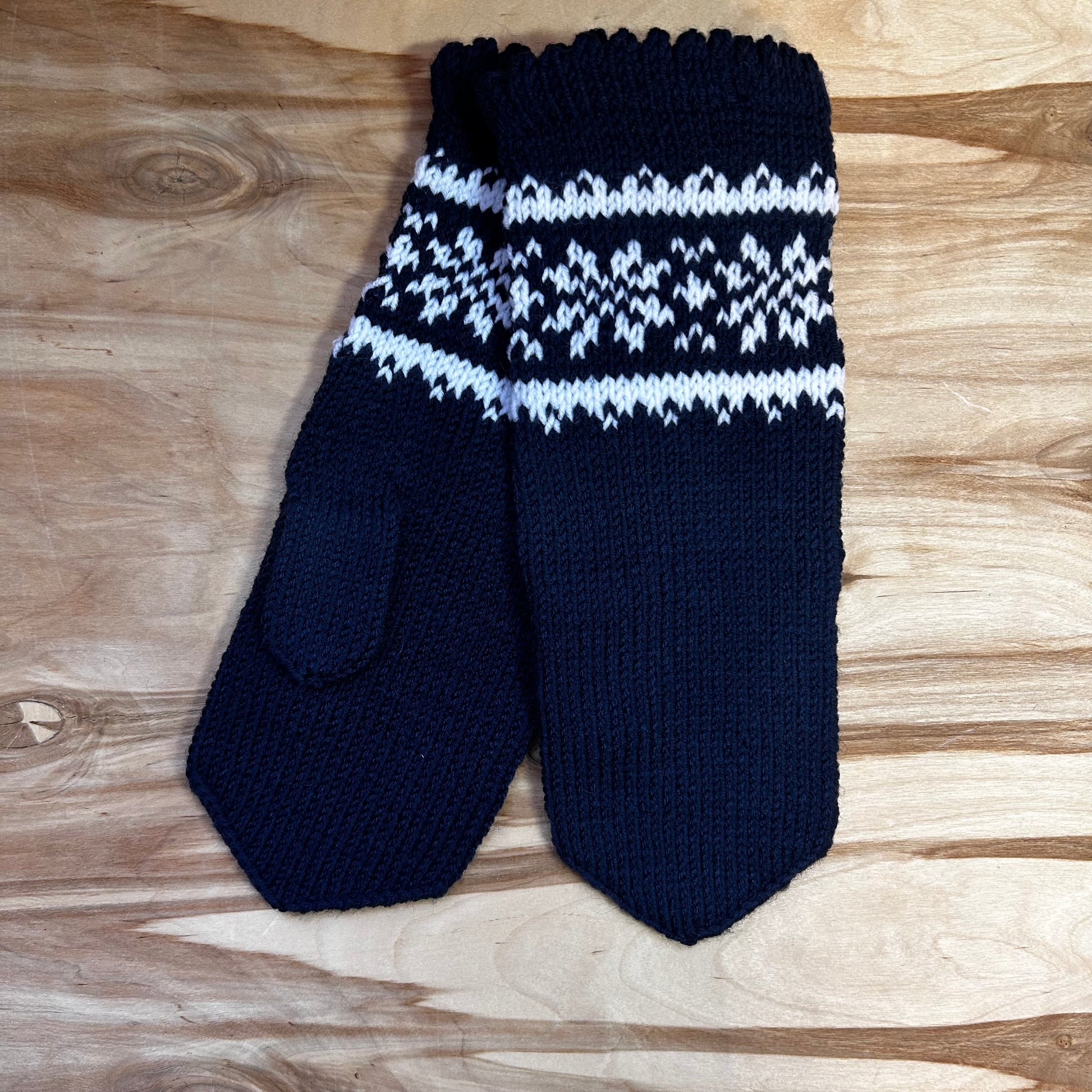 Rokām adīti tumši zili dūraiņi ar baltu rakstu stulma daļā. Garums ~32 cm, platums ~12 cm.