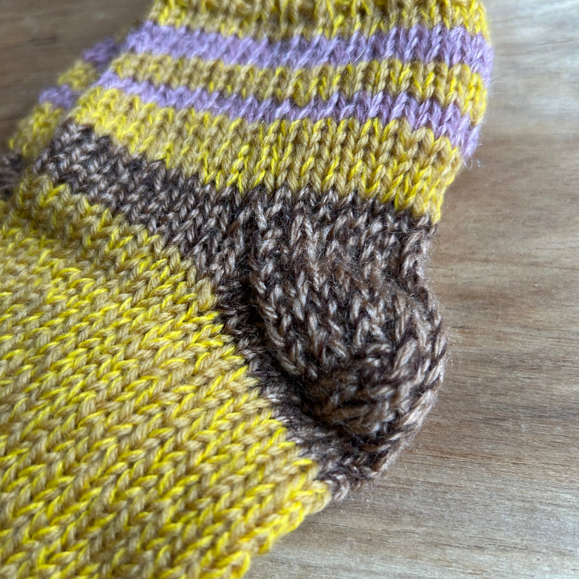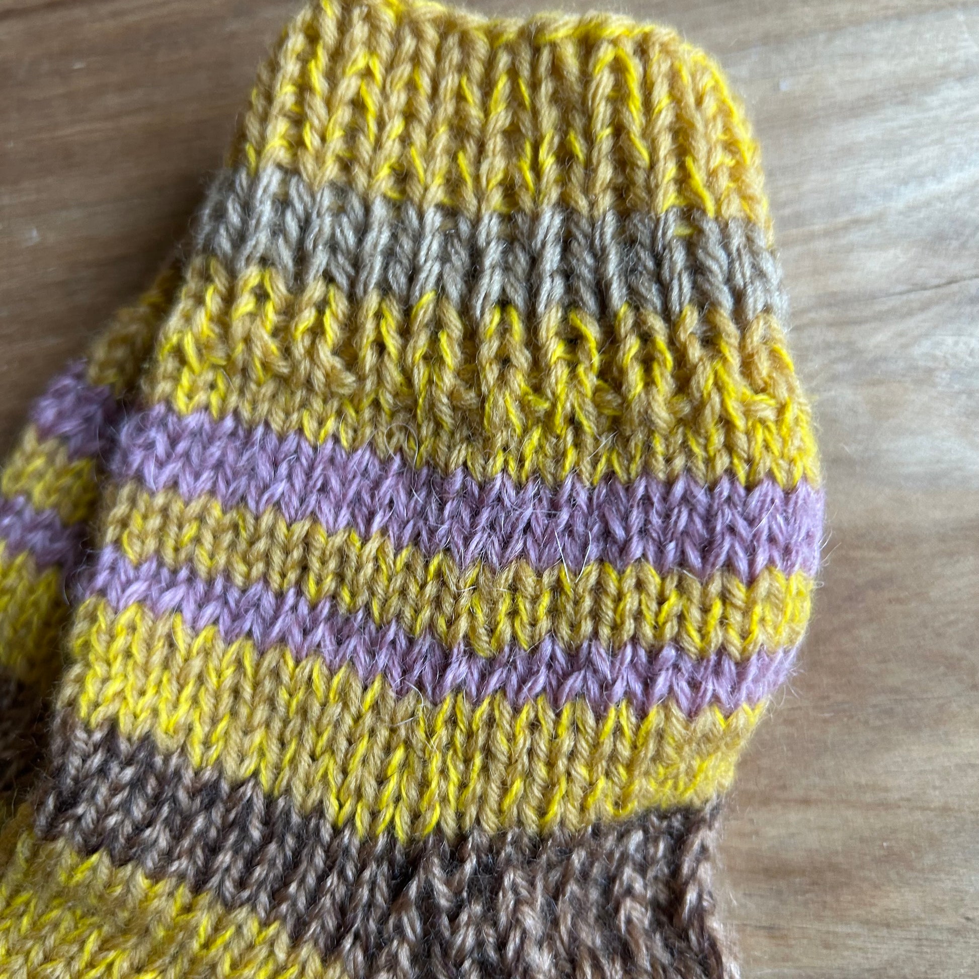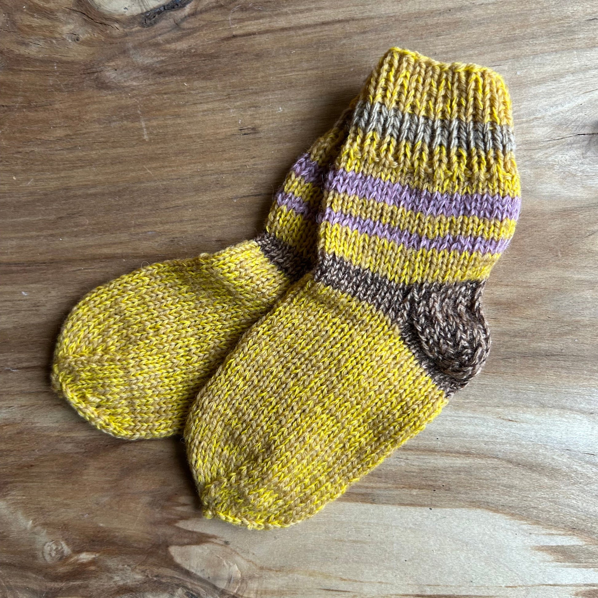 Rokām adītas siltās zeķes bērniem 24.-26.izm. Sinepju dzeltenā krāsā ar strīpām pelēkos, brūnos un lillā toņos.