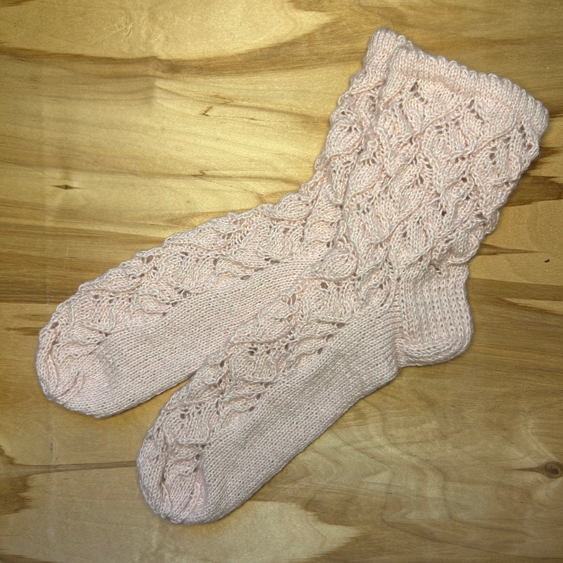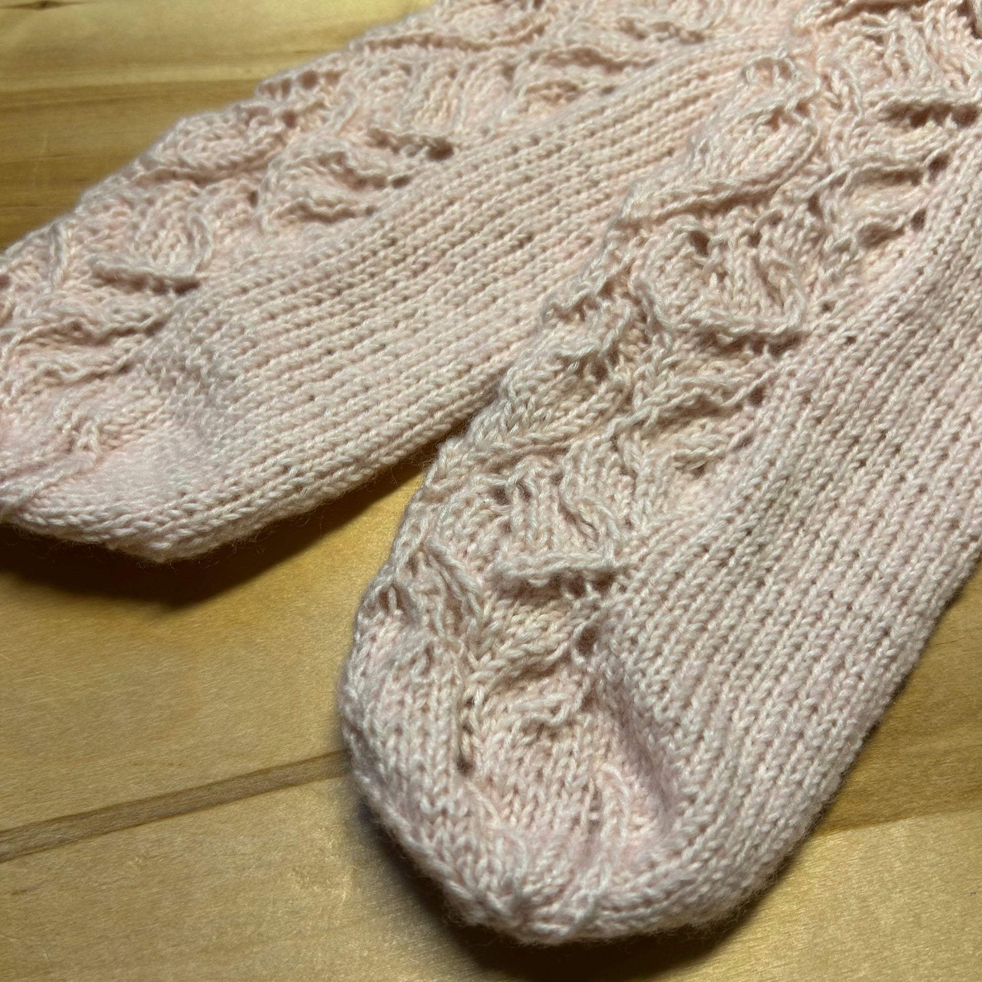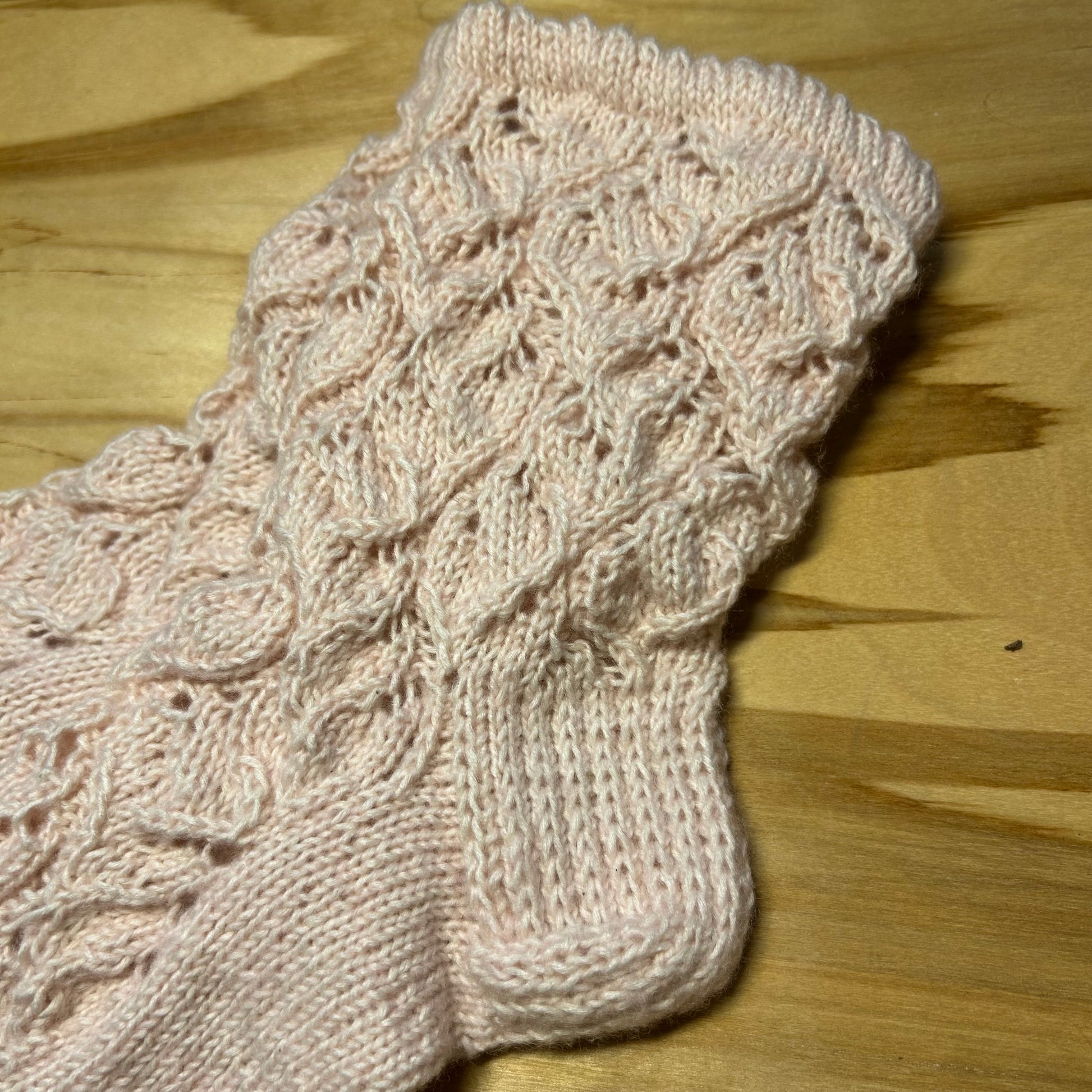 Rokām mežģīņu rakstā adītas maigi rozā krāsas siltās zeķes 40.-42. izm. Stulma augstums ~13 cm / pēdas garums ~26 cm.