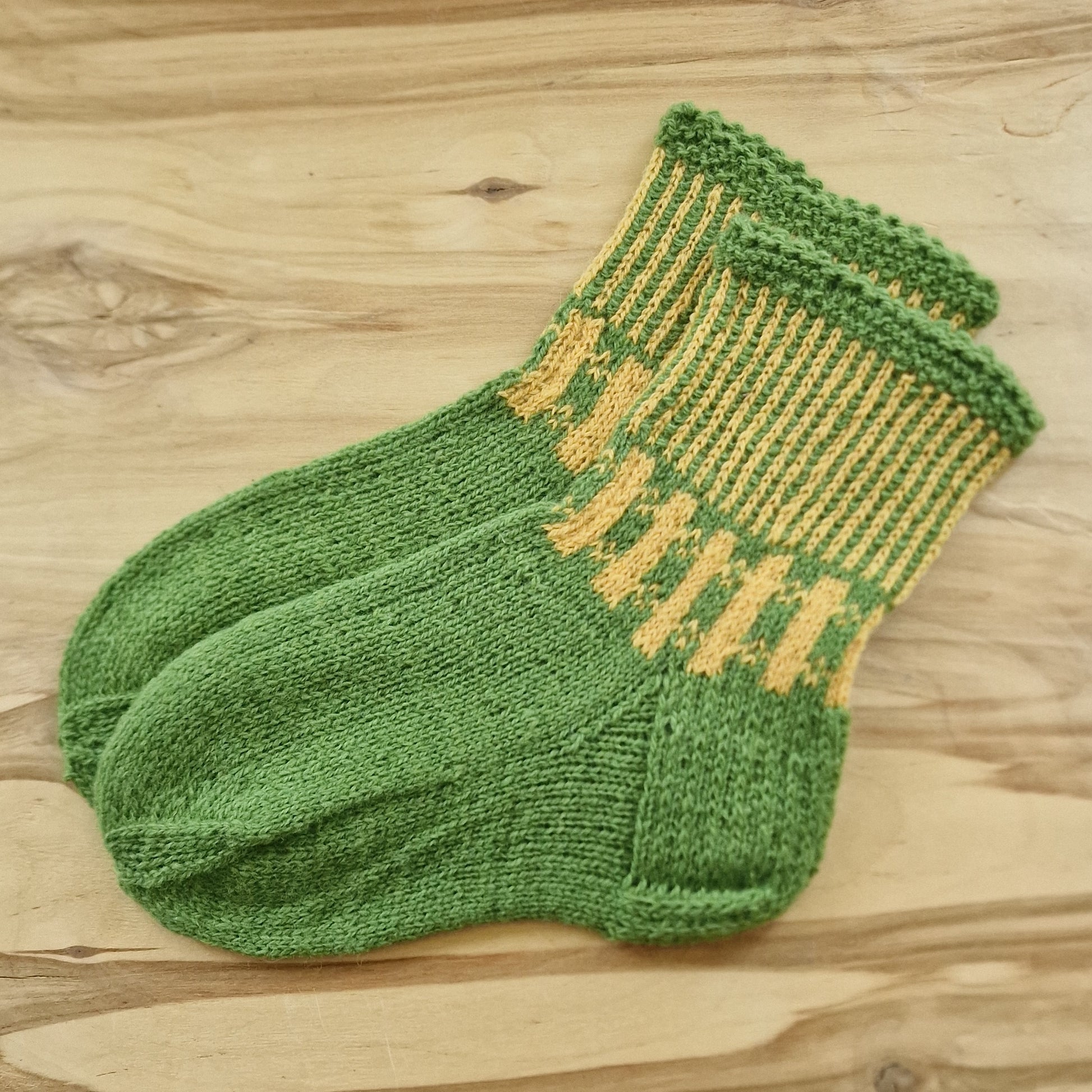 Rokām adītas zaļas siltās zeķes 36.-38.izm. ar dzeltenu dekoratīvu adījumu uz stulma. Stulma augstums ~11 cm / adītās pēdas garums neiestiepjot ~23 cm.