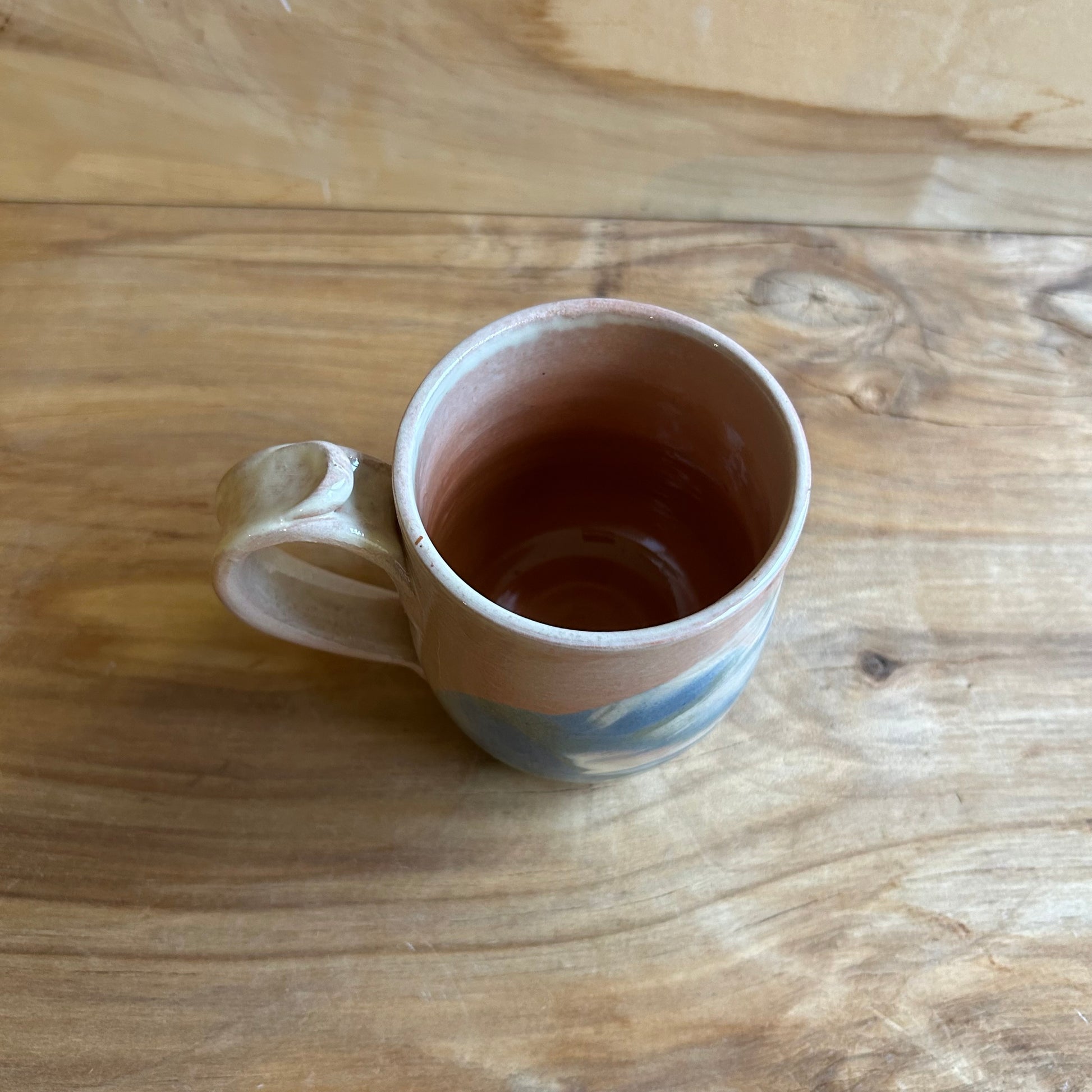 Rokām veidota māla krūze ar glazētu iekšpusi, krāsainu ārējo glazūru un parocīgu veidojumu uz roktura. Krūzes augstums ~8,5 cm, diametrs ~8 cm, tilpums ~300 ml.