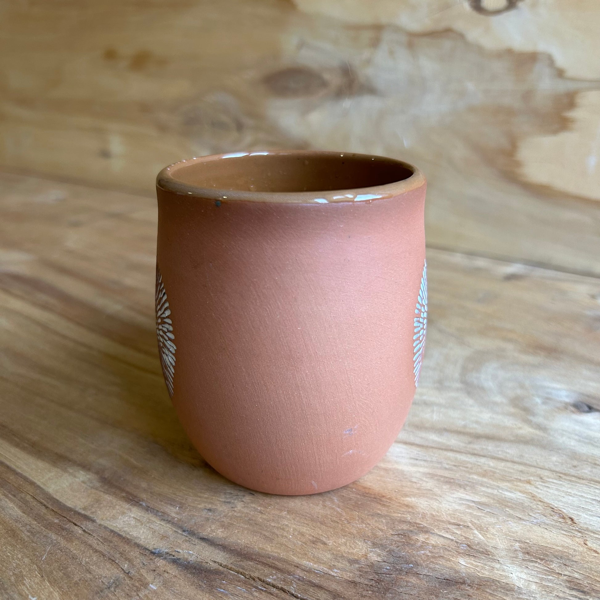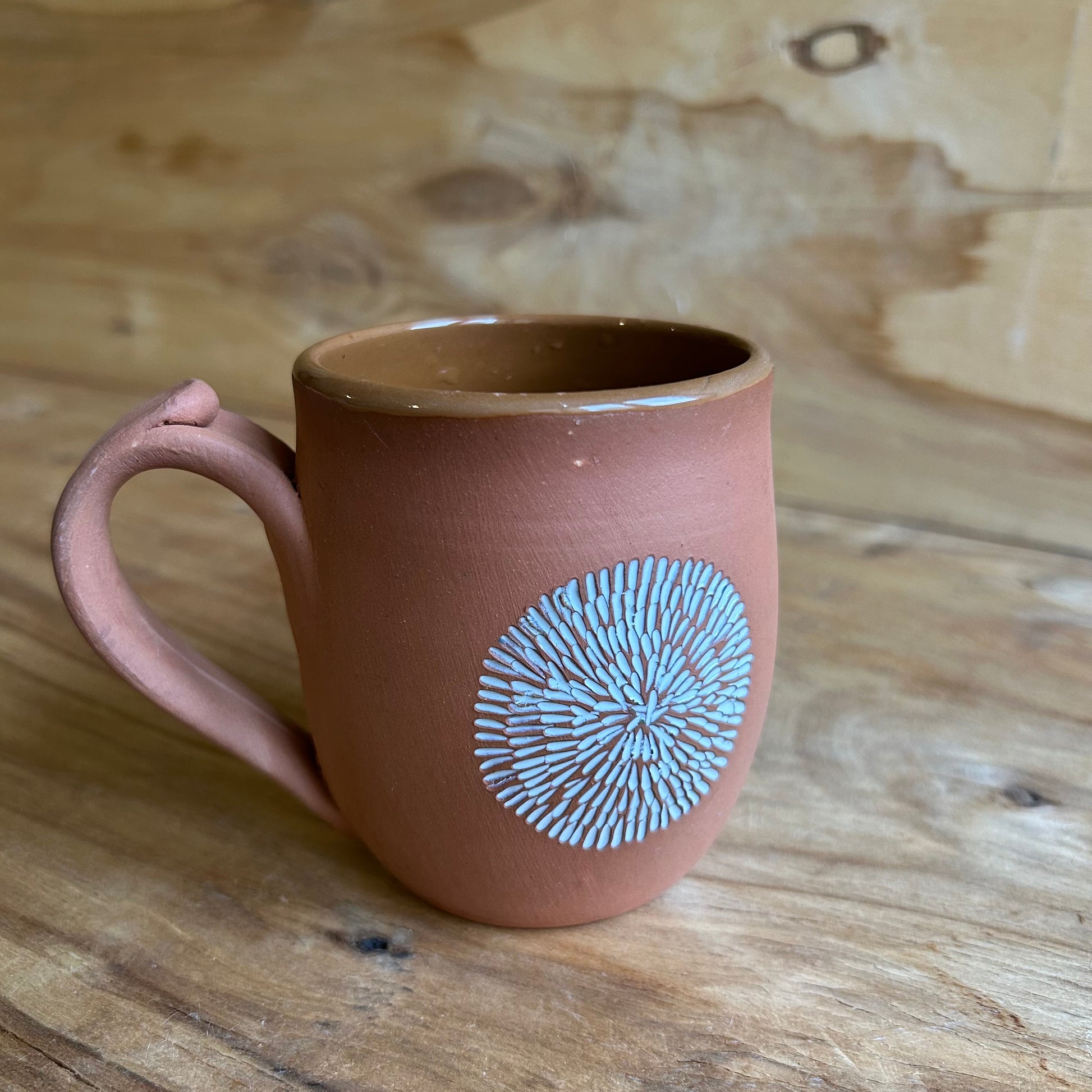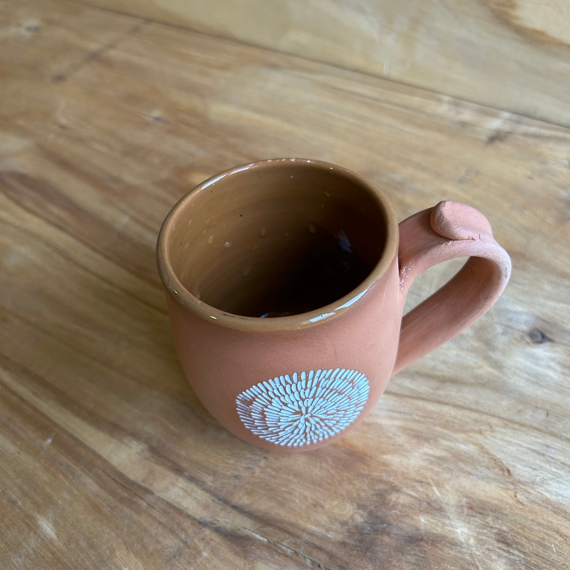 Rokām veidota brūna māla krūze ar brūnu glazētu iekšpusi, un baltu skrāpziedu ornamentu sānos.