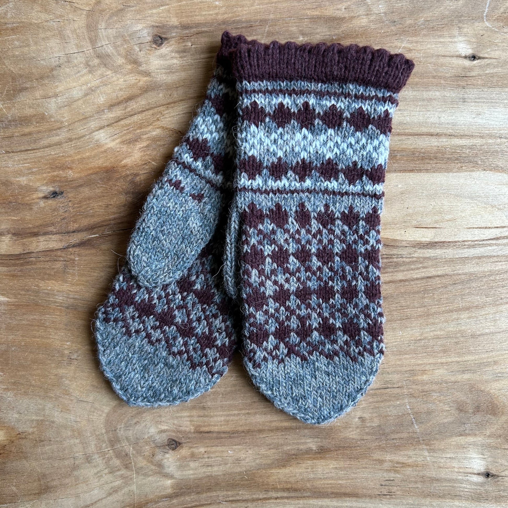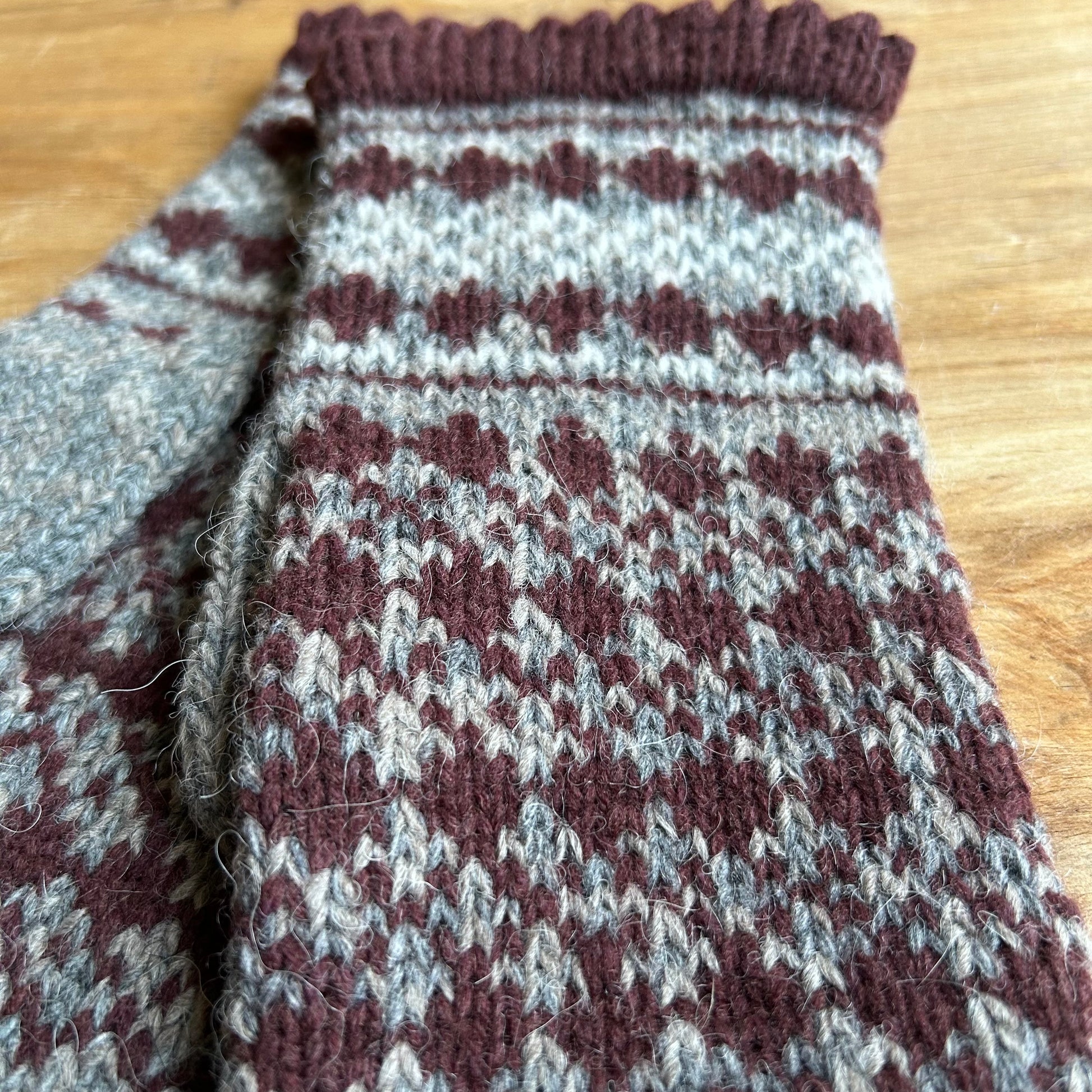 Rokām adīti sieviešu dūraiņi pelēkā krāsā ar brūniem ornamentiem. Garums 25 cm, platums 10 cm.