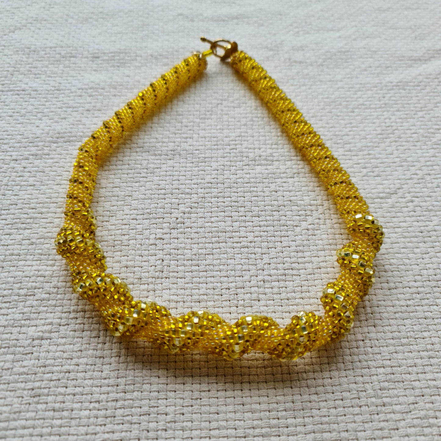 Grezna dzeltena divu toņu pērļota cilindriska kaklarota ar sašaurinātiem galiem un zelta krāsas aizdari.